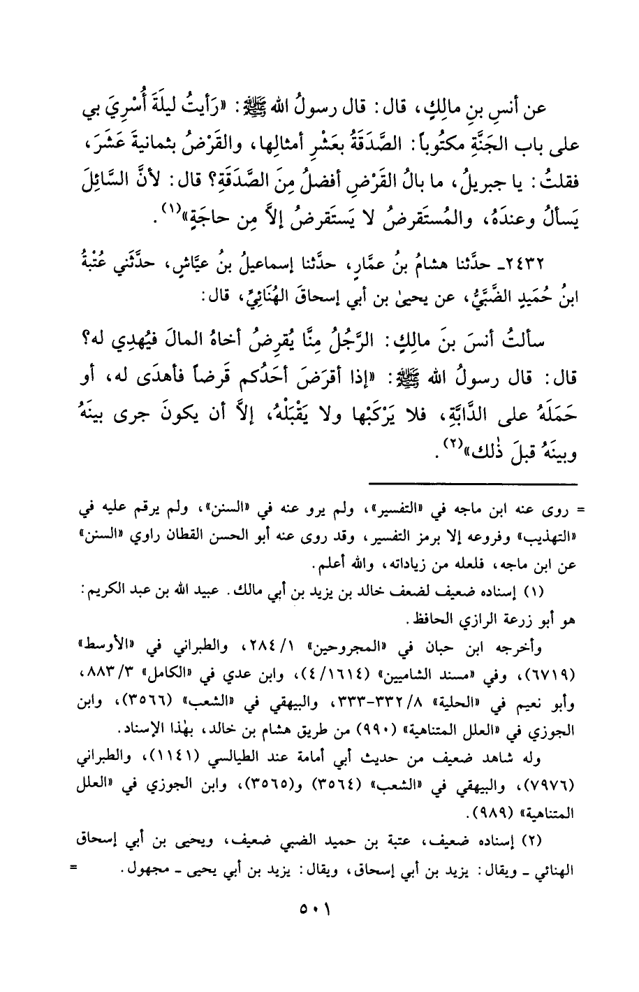 2432- حَدَّثَنَا هِشَامُ بْنُ عَمَّارٍ ، حَدَّثَنَا إِسْمَاعِيلُ بْنُ عَيَّاشٍ , حَدَّثَنِي عُتْبَةُ بْنُ حُمَيْدٍ الضَّبِّيُّ ، عَنْ يَحْيَى بْنِ أَبِي إِسْحَاقَ الْهُنَائِيِّ ، قَالَ : سَأَلْتُ أَنَسَ بْنَ مَالِكٍ : الرَّجُلُ مِنَّا يُقْرِضُ أَخَاهُ الْمَالَ فَيُهْدِي لَهُ ؟ قَالَ : قَالَ رَسُولُ اللهِ صَلَّى الله عَليْهِ وسَلَّمَ : إِذَا أَقْرَضَ أَحَدُكُمْ قَرْضًا ، فَأَهْدَى لَهُ ، أَوْ حَمَلَهُ عَلَى الدَّابَّةِ ، فَلاَ يَرْكَبْهَا وَلاَ يَقْبَلْهُ ، إِلاَّ أَنْ يَكُونَ جَرَى بَيْنَهُ وَبَيْنَهُ قَبْلَ ذَلِكَ.