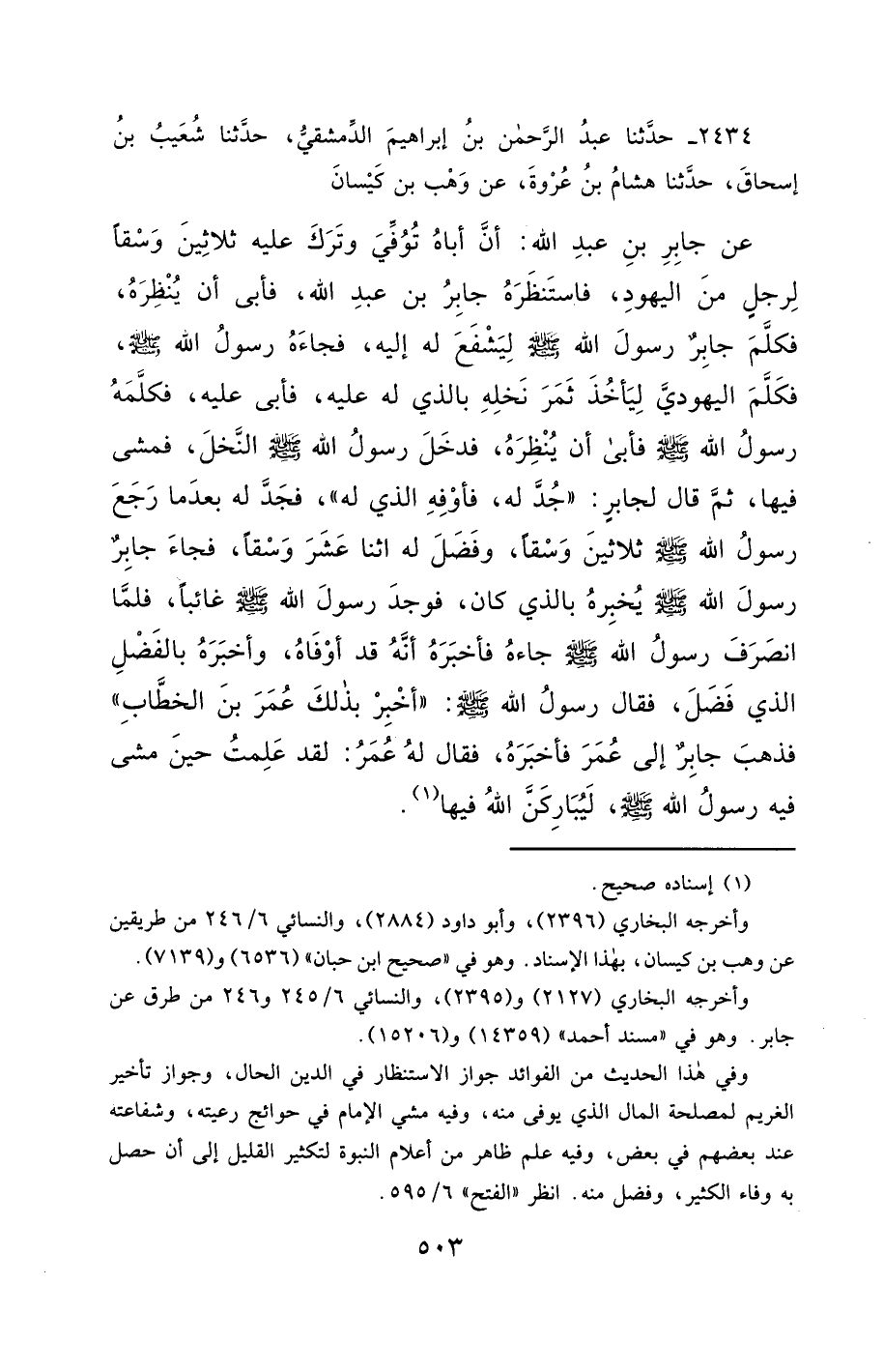 2434- حَدَّثَنَا عَبْدُ الرَّحْمَنِ بْنُ إِبْرَاهِيمَ الدِّمَشْقِيُّ ، حَدَّثَنَا شُعَيْبُ بْنُ إِسْحَاقَ ، حَدَّثَنَا هِشَامُ بْنُ عُرْوَةَ ، عَنْ وَهْبِ بْنِ كَيْسَانَ ، عَنْ جَابِرِ بْنِ عَبْدِ اللهِ ، أَنَّ أَبَاهُ تُوُفِّيَ وَتَرَكَ عَلَيْهِ ثَلاَثِينَ وَسْقًا لِرَجُلٍ مِنَ الْيَهُودِ ، فَاسْتَنْظَرَهُ جَابِرُ بْنُ عَبْدِ اللهِ ، فَأَبَى أَنْ يُنْظِرَهُ , فَكَلَّمَ جَابِرٌ رَسُولَ اللهِ صَلَّى الله عَليْهِ وسَلَّمَ لِيَشْفَعَ لَهُ إِلَيْهِ ، فَجَاءَهُ رَسُولُ اللهِ صَلَّى الله عَليْهِ وسَلَّمَ ، فَكَلَّمَ الْيَهُودِيَّ لِيَأْخُذَ ثَمَرَ نَخْلِهِ بِالَّذِي لَهُ عَلَيْهِ ، فَأَبَى عَلَيْهِ ، فَكَلَّمَهُ رَسُولُ اللهِ صَلَّى الله عَليْهِ وسَلَّمَ فَأَبَى أَنْ يُنْظِرَهُ ، فَدَخَلَ رَسُولُ اللهِ صَلَّى الله عَليْهِ وسَلَّمَ النَّخْلَ ، فَمَشَى فِيهَا ، ثُمَّ قَالَ لِجَابِرٍ : جُدَّ لَهُ فَأَوْفِهِ الَّذِي لَهُ ، فَجَدَّ لَهُ بَعْدَ مَا رَجَعَ رَسُولُ اللهِ صَلَّى الله عَليْهِ وسَلَّمَ ثَلاَثِينَ وَسْقًا ، وَفَضَلَ لَهُ اثْنَا عَشَرَ وَسْقًا ، فَجَاءَ جَابِرٌ رَسُولَ اللهِ صَلَّى الله عَليْهِ وسَلَّمَ يُخْبِرَهُ بِالَّذِي كَانَ ، فَوَجَدَ رَسُولَ اللهِ صَلَّى الله عَليْهِ وسَلَّمَ غَائِبًا ، فَلَمَّا انْصَرَفَ رَسُولُ اللهِ صَلَّى الله عَليْهِ وسَلَّمَ جَاءَهُ فَأَخْبَرَهُ أَنَّهُ قَدْ أَوْفَاهُ ، وَأَخْبَرَهُ بِالْفَضْلِ الَّذِي فَضَلَ ، فَقَالَ رَسُولُ اللهِ صَلَّى الله عَليْهِ وسَلَّمَ : أَخْبِرْ بِذَلِكَ عُمَرَ بْنَ الْخَطَّابِ ، فَذَهَبَ جَابِرٌ إِلَى عُمَرَ فَأَخْبَرَهُ ، فَقَالَ لَهُ عُمَرُ : لَقَدْ عَلِمْتُ حِينَ مَشَى فِيهِ رَسُولُ اللهِ صَلَّى الله عَليْهِ وسَلَّمَ ، لَيُبَارِكَنَّ اللَّهُ فِيهَا.