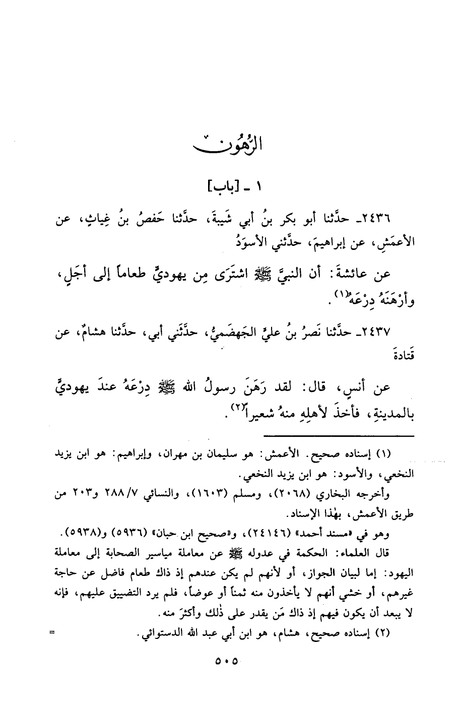 2436- حَدَّثَنَا أَبُو بَكْرِ بْنُ أَبِي شَيْبَةَ ، حَدَّثَنَا حَفْصُ بْنُ غِيَاثٍ ، عَنِ الأَعْمَشِ ، عَنْ إِبْرَاهِيمَ , حَدَّثَنِي الأَسْوَدُ ، عَنْ عَائِشَةَ ، أَنَّ النَّبِيَّ صَلَّى الله عَليْهِ وسَلَّمَ اشْتَرَى مِنْ يَهُودِيٍّ طَعَامًا إِلَى أَجَلٍ ، وَأَرْهَنَهُ دِرْعَهُ.