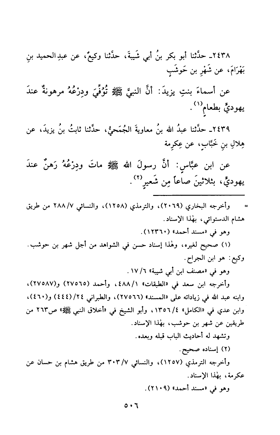2438- حَدَّثَنَا أَبُو بَكْرِ بْنُ أَبِي شَيْبَةَ ، حَدَّثَنَا وَكِيعٌ ، عَنْ عَبْدِ الْحَمِيدِ بْنِ بَهْرَامَ ، عَنْ شَهْرِ بْنِ حَوْشَبٍ ، عَنْ أَسْمَاءَ بِنْتِ يَزِيدَ ، أَنَّ النَّبِيَّ صَلَّى الله عَليْهِ وسَلَّمَ تُوُفِّيَ وَدِرْعُهُ مَرْهُونَةٌ عِنْدَ يَهُودِيٍّ بِطَعَامٍ.