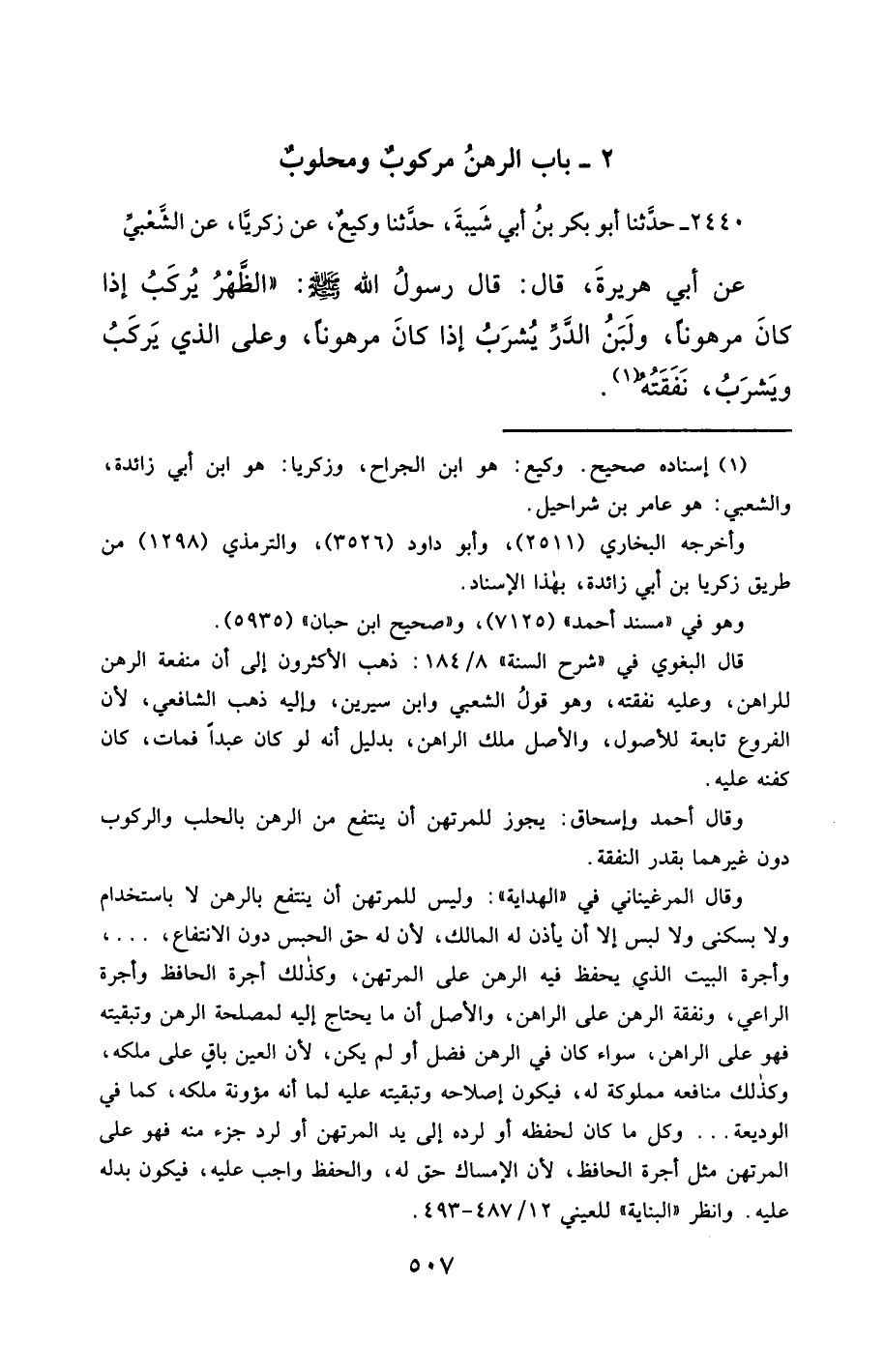 2440- حَدَّثَنَا أَبُو بَكْرِ بْنُ أَبِي شَيْبَةَ ، حَدَّثَنَا وَكِيعٌ ، عَنْ زَكَرِيَّا ، عَنِ الشَّعْبِيِّ ، عَنْ أَبِي هُرَيْرَةَ ، قَالَ : قَالَ رَسُولُ اللهِ صَلَّى الله عَليْهِ وسَلَّمَ : الظَّهْرُ يُرْكَبُ إِذَا كَانَ مَرْهُونًا ، وَلَبَنُ الدَّرِّ يُشْرَبُ إِذَا كَانَ مَرْهُونًا ، وَعَلَى الَّذِي يَرْكَبُ وَيَشْرَبُ نَفَقَتُهُ.