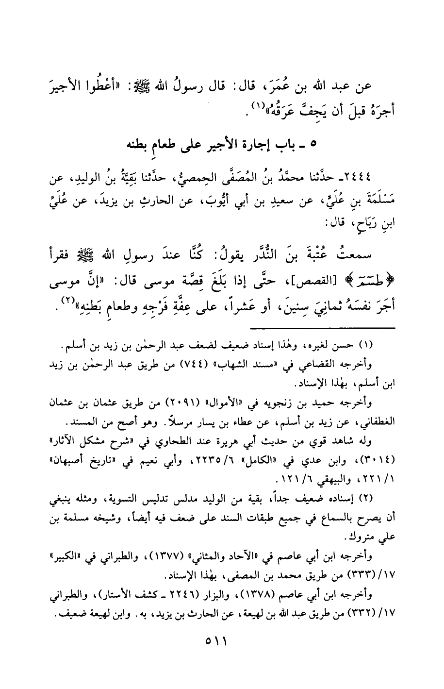 2444- حَدَّثَنَا مُحَمَّدُ بْنُ الْمُصَفَّى الْحِمْصِيُّ ، حَدَّثَنَا بَقِيَّةُ بْنُ الْوَلِيدِ ، عَنْ مَسْلَمَةَ بْنِ عُلَيٍّ ، عَنْ سَعِيدِ بْنِ أَبِي أَيُّوبَ ، عَنِ الْحَارِثِ بْنِ يَزِيدَ ، عَنْ عُلَيِّ بْنِ رَبَاحٍ ، قَالَ : سَمِعْتُ عُتْبَةَ بْنَ النُّدَّرِ يَقُولُ : كُنَّا عِنْدَ رَسُولِ اللهِ صَلَّى الله عَليْهِ وسَلَّمَ ، فَقَرَأَ {طسم} ، حَتَّى إِذَا بَلَغَ قِصَّةَ مُوسَى ، قَالَ : إِنَّ مُوسَى أَجَرَ نَفْسَهُ ثَمَانِيَ سِنِينَ ، أَوْ عَشْرًا ، عَلَى عِفَّةِ فَرْجِهِ ، وَطَعَامِ بَطْنِهِ.