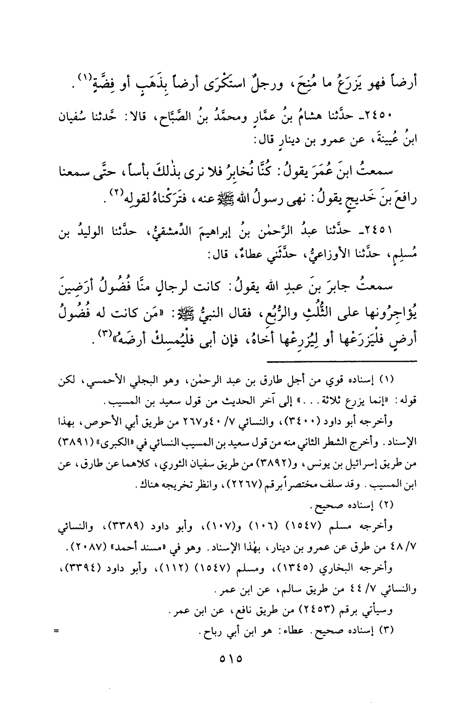 2451- حَدَّثَنَا عَبْدُ الرَّحْمَنِ بْنُ إِبْرَاهِيمَ الدِّمَشْقِيُّ ، حَدَّثَنَا الْوَلِيدُ بْنُ مُسْلِمٍ ، حَدَّثَنَا الأَوْزَاعِيُّ , حَدَّثَنِي عَطَاءٌ ، قَالَ : سَمِعْتُ جَابِرَ بْنَ عَبْدِ اللهِ يَقُولُ : كَانَتْ لِرِجَالٍ مِنَّا فُضُولُ أَرَضِينَ يُؤَاجِرُونَهَا عَلَى الثُّلُثِ وَالرُّبُعِ ، فَقَالَ النَّبِيُّ صَلَّى الله عَليْهِ وسَلَّمَ : مَنْ كَانَتْ لَهُ فُضُولُ أَرَضٍ فَلْيَزْرَعْهَا ، أَوْ لِيُزْرِعْهَا أَخَاهُ ، فَإِنْ أَبَى , فَلْيُمْسِكْ أَرْضَهُ.