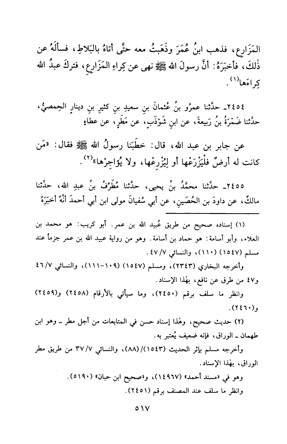 2454- حَدَّثَنَا عَمْرُو بْنُ عُثْمَانَ بْنِ سَعِيدِ بْنِ كَثِيرِ بْنِ دِينَارٍ الْحِمْصِيُّ ، حَدَّثَنَا ضَمْرَةُ بْنُ رَبِيعَةَ ، عَنِ ابْنِ شَوْذَبٍ ، عَنْ مَطَرٍ ، عَنْ عَطَاءٍ ، عَنْ جَابِرِ بْنِ عَبْدِ اللهِ ، قَالَ : خَطَبَنَا رَسُولُ اللهِ صَلَّى الله عَليْهِ وسَلَّمَ ، فَقَالَ : مَنْ كَانَتْ لَهُ أَرْضٌ فَلْيَزْرَعْهَا ، أَوْ لِيُزْرِعْهَا ، وَلاَ يُؤَاجِرْهَا.
