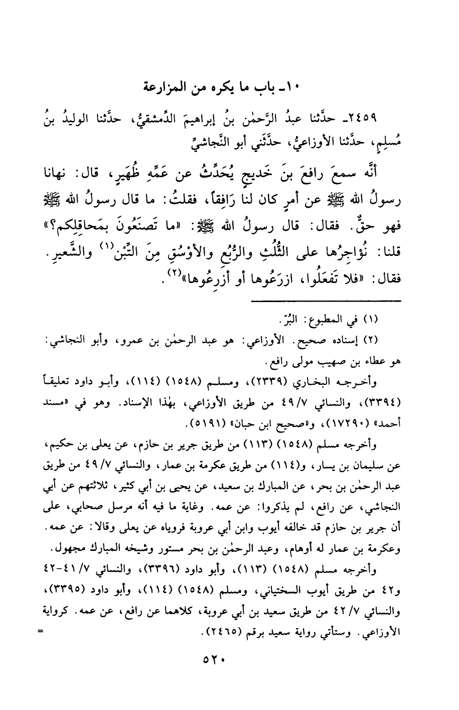2459- حَدَّثَنَا عَبْدُ الرَّحْمَنِ بْنُ إِبْرَاهِيمَ الدِّمَشْقِيُّ ، حَدَّثَنَا الْوَلِيدُ بْنُ مُسْلِمٍ ، حَدَّثَنَا الأَوْزَاعِيُّ , حَدَّثَنِي أَبُو النَّجَاشِيِّ ، أَنَّهُ سَمِعَ رَافِعَ بْنَ خَدِيجٍ يُحَدِّثُ عَنْ عَمِّهِ ظُهَيْرٍ قَالَ : نَهَانَا رَسُولُ اللهِ صَلَّى الله عَليْهِ وسَلَّمَ عَنْ أَمْرٍ كَانَ لَنَا رَافِقًا ، فَقُلْتُ : مَا قَالَ رَسُولُ اللهِ صَلَّى الله عَليْهِ وسَلَّمَ فَهُوَ حَقٌّ ، فَقَالَ : قَالَ رَسُولُ اللهِ صَلَّى الله عَليْهِ وسَلَّمَ : مَا تَصْنَعُونَ بِمَحَاقِلِكُمْ ؟ قُلْنَا : نُؤَاجِرُهَا عَلَى الثُّلُثِ ، وَالرُّبُعِ ، وَالأَوْسُقِ مِنَ التِّبْنِ وَالشَّعِيرِ ، فَقَالَ : فَلاَ تَفْعَلُوا ، ازْرَعُوهَا ، أَوْ أَزْرِعُوهَا.