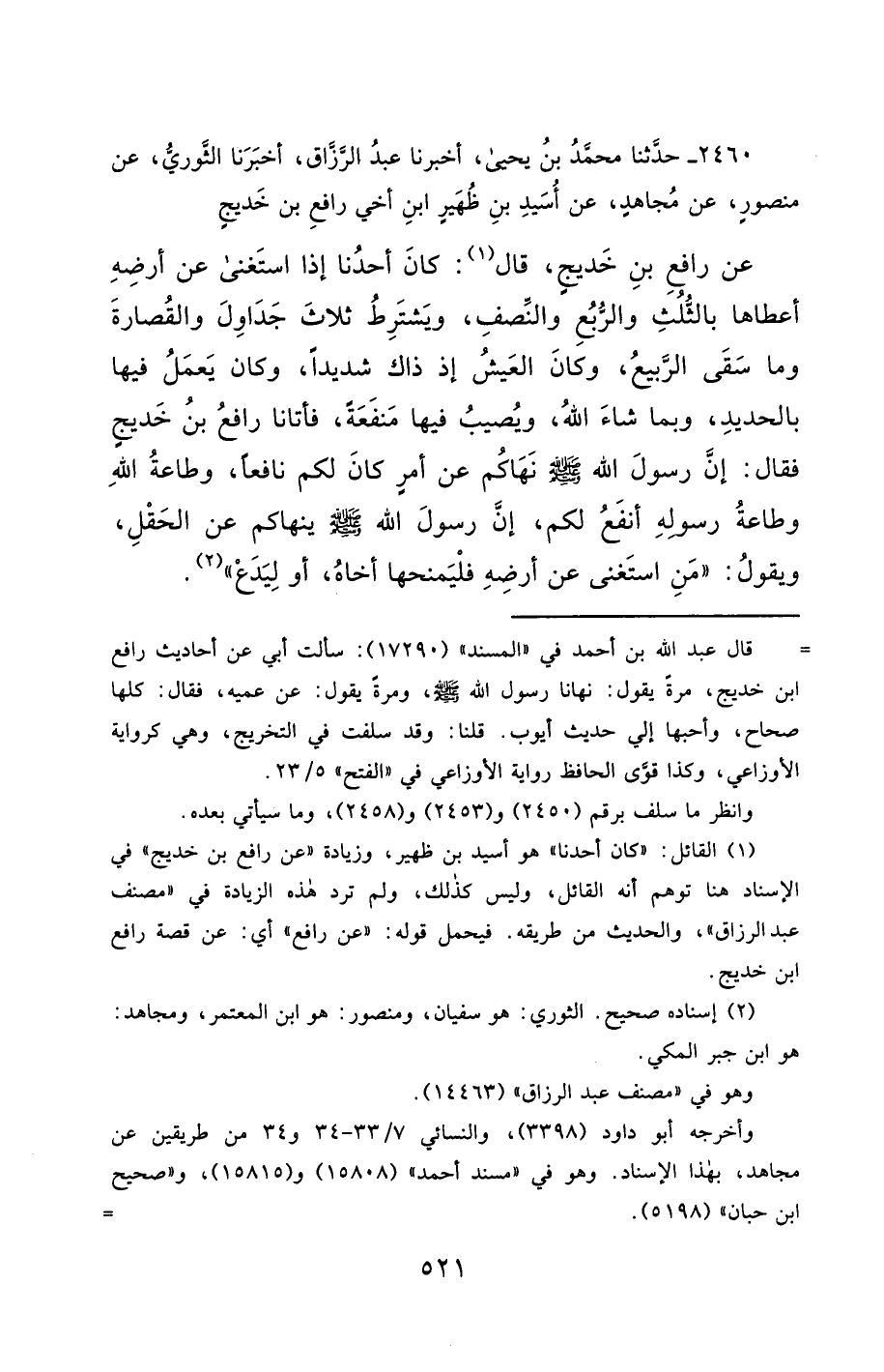 2460- حَدَّثَنَا مُحَمَّدُ بْنُ يَحْيَى ، أَخْبَرَنَا عَبْدُ الرَّزَّاقِ ، أَخْبَرَنَا الثَّوْرِيُّ ، عَنْ مَنْصُورٍ ، عَنْ مُجَاهِدٍ ، عَنْ أُسَيْدِ بْنِ ظُهَيْرٍ ، ابْنِ أَخِي رَافِعِ بْنِ خَدِيجٍ ، عَنْ رَافِعِ بْنِ خَدِيجٍ ، قَالَ : كَانَ أَحَدُنَا إِذَا اسْتَغْنَى عَنْ أَرْضِهِ أَعْطَاهَا بِالثُّلُثِ وَالرُّبُعِ وَالنِّصْفِ ، وَيَشْتَرِطُ ثَلاَثَ جَدَاوِلَ ، وَالْقُصَارَةَ ، وَمَا سَقَى الرَّبِيعُ ، وَكَانَ الْعَيْشُ إِذْ ذَاكَ شَدِيدًا ، وَكَانَ يَعْمَلُ فِيهَا بِالْحَدِيدِ ، وَبِمَا شَاءَ اللَّهُ ، وَيُصِيبُ فِيهَا مَنْفَعَةً ، فَأَتَانَا رَافِعُ بْنُ خَدِيجٍ ، فَقَالَ : إِنَّ رَسُولَ اللهِ صَلَّى الله عَليْهِ وسَلَّمَ نَهَاكُمْ عَنْ أَمْرٍ كَانَ لَكُمْ نَافِعًا ، وَطَاعَةُ اللهِ وَطَاعَةُ رَسُولِهِ أَنْفَعُ لَكُمْ ، إِنَّ رَسُولَ اللهِ صَلَّى الله عَليْهِ وسَلَّمَ يَنْهَاكُمْ عَنِ الْحَقْلِ ، وَيَقُولُ : مَنِ اسْتَغْنَى عَنْ أَرْضِهِ فَلْيَمْنَحْهَا أَخَاهُ ، أَوْ لِيَدَعْ.