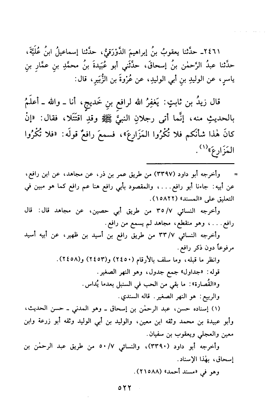 2461- حَدَّثَنَا يَعْقُوبُ بْنُ إِبْرَاهِيمَ الدَّوْرَقِيُّ ، حَدَّثَنَا إِسْمَاعِيلُ ابْنُ عُلَيَّةَ ، حَدَّثَنَا عَبْدُ الرَّحْمَنِ بْنُ إِسْحَاقَ , حَدَّثَنِي أَبُو عُبَيْدَةَ بْنُ مُحَمَّدِ بْنِ عَمَّارِ بْنِ يَاسِرٍ ، عَنِ الْوَلِيدِ بْنِ أَبِي الْوَلِيدِ ، عَنْ عُرْوَةَ بْنِ الزُّبَيْرِ ، قَالَ : قَالَ زَيْدُ بْنُ ثَابِتٍ : يَغْفِرُ اللَّهُ لِرَافِعِ بْنِ خَدِيجٍ , أَنَا , وَاللَّهِ ، أَعْلَمُ بِالْحَدِيثِ مِنْهُ ، إِنَّمَا أَتَى رَجُلاَنِ النَّبِيَّ صَلَّى الله عَليْهِ وسَلَّمَ ، وَقَدِ اقْتَتَلاَ ، فَقَالَ : إِنْ كَانَ هَذَا شَأْنُكُمْ فَلاَ تُكْرُوا الْمَزَارِعَ ، فَسَمِعَ رَافِعٌ قَوْلَهُ : فَلاَ تُكْرُوا الْمَزَارِعَ.