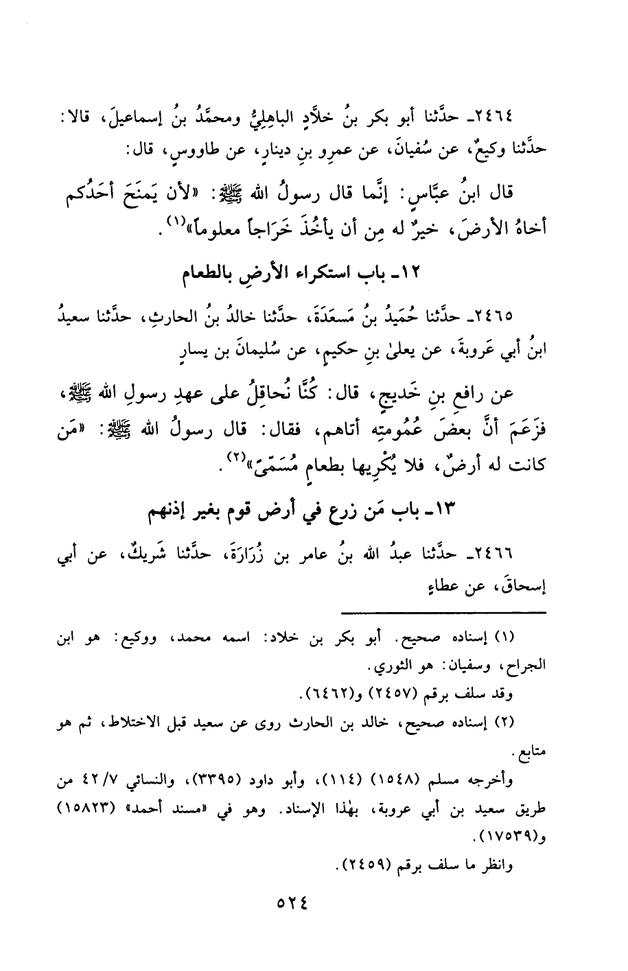 2464- حَدَّثَنَا أَبُو بَكْرِ بْنُ خَلاَّدٍ الْبَاهِلِيُّ ، وَمُحَمَّدُ بْنُ إِسْمَاعِيلَ ، قَالاَ : حَدَّثَنَا وَكِيعٌ ، عَنْ سُفْيَانَ ، عَنْ عَمْرِو بْنِ دِينَارٍ ، عَنْ طَاوُوسٍ ، قَالَ : قَالَ ابْنُ عَبَّاسٍ : إِنَّمَا قَالَ رَسُولُ اللهِ صَلَّى الله عَليْهِ وسَلَّمَ : لأَنْ يَمْنَحَ أَحَدُكُمْ أَخَاهُ الأَرْضَ ، خَيْرٌ لَهُ مِنْ أَنْ يَأْخُذَ خَرَاجًا مَعْلُومًا.