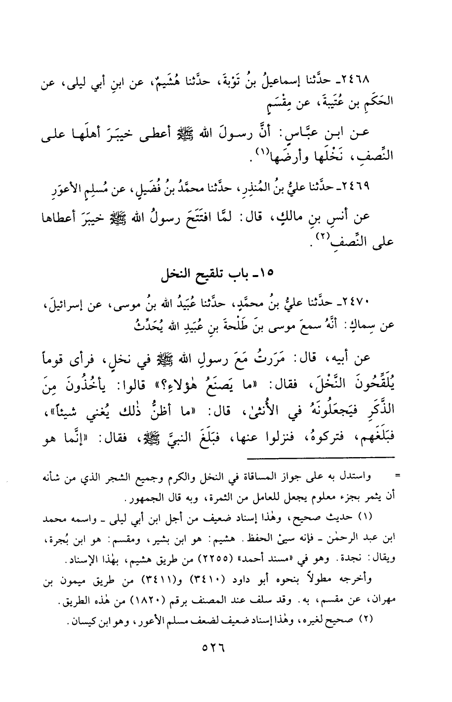 2468- حَدَّثَنَا إِسْمَاعِيلُ بْنُ تَوْبَةَ ، حَدَّثَنَا هُشَيْمٌ ، عَنِ ابْنِ أَبِي لَيْلَى ، عَنِ الْحَكَمِ بْنِ عُتَيْبَةَ ، عَنْ مِقْسَمٍ ، عَنِ ابْنِ عَبَّاسٍ ، أَنَّ رَسُولَ اللهِ صَلَّى الله عَليْهِ وسَلَّمَ أَعْطَى خَيْبَرَ أَهْلَهَا عَلَى النِّصْفِ نَخْلَِهَا وَأَرْضَِهَا.