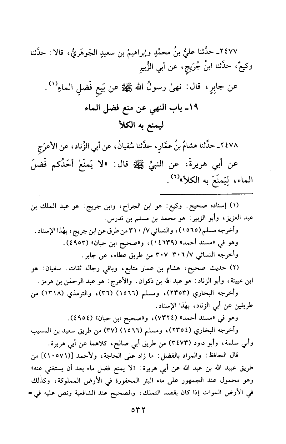 2478- حَدَّثَنَا هِشَامُ بْنُ عَمَّارٍ ، حَدَّثَنَا سُفْيَانُ ، عَنْ أَبِي الزِّنَادِ ، عَنِ الأَعْرَجِ ، عَنْ أَبِي هُرَيْرَةَ ، عَنِ النَّبِيِّ صَلَّى الله عَليْهِ وسَلَّمَ قَالَ : لاَ يَمْنَعْ أَحَدُكُمْ فَضْلَ الْمَاءِ ، لِيَمْنَعَ بِهِ الْكَلأَ.