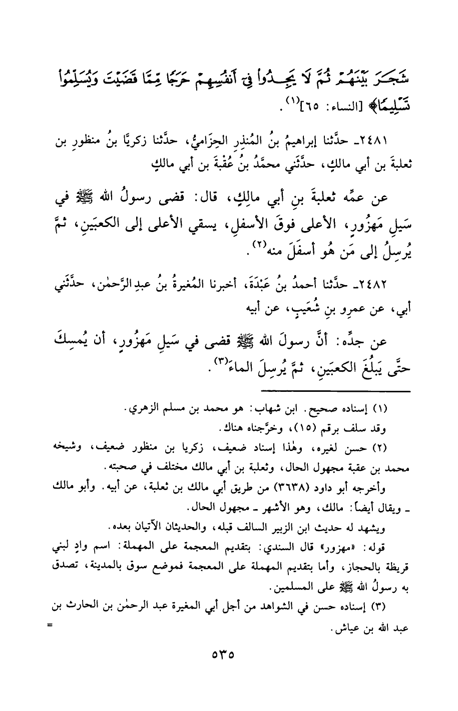 2481- حَدَّثَنَا إِبْرَاهِيمُ بْنُ الْمُنْذِرِ الْحِزَامِيُّ ، حَدَّثَنَا زَكَرِيَّا بْنُ مَنْظُورِ بْنِ ثَعْلَبَةَ بْنِ أَبِي مَالِكٍ , حَدَّثَنِي مُحَمَّدُ بْنُ عُقْبَةَ بْنِ أَبِي مَالِكٍ ، عَنْ عَمِّهِ ثَعْلَبَةَ بْنِ أَبِي مَالِكٍ , قَالَ : قَضَى رَسُولُ اللهِ صَلَّى الله عَليْهِ وسَلَّمَ فِي سَيْلِ مَهْزُورٍ ، الأَعْلَى فَوْقَ الأَسْفَلِ ، يَسْقِي الأَعْلَى إِلَى الْكَعْبَيْنِ ، ثُمَّ يُرْسِلُ إِلَى مَنْ هُوَ أَسْفَلَ مِنْهُ.