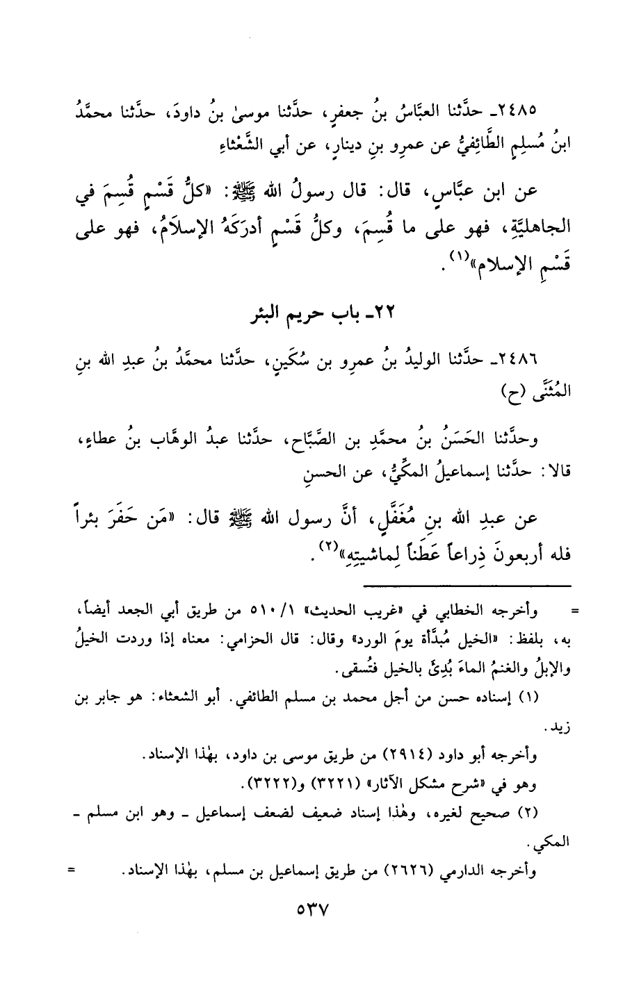 2485- حَدَّثَنَا الْعَبَّاسُ بْنُ جَعْفَرٍ ، حَدَّثَنَا مُوسَى بْنُ دَاوُدَ ، حَدَّثَنَا مُحَمَّدُ بْنُ مُسْلِمٍ الطَّائِفِيُّ ، عَنْ عَمْرِو بْنِ دِينَارٍ ، عَنْ أَبِي الشَّعْثَاءِ ، عَنِ ابْنِ عَبَّاسٍ ، قَالَ : قَالَ رَسُولُ اللهِ صَلَّى الله عَليْهِ وسَلَّمَ : كُلُّ قَسْمٍ قُسِمَ فِي الْجَاهِلِيَّةِ ، فَهُوَ عَلَى مَا قُسِمَ ، وَكُلُّ قَسْمٍ أَدْرَكَهُ الإِسْلاَمُ ، فَهُوَ عَلَى قَسْمِ الإِسْلاَمِ.
