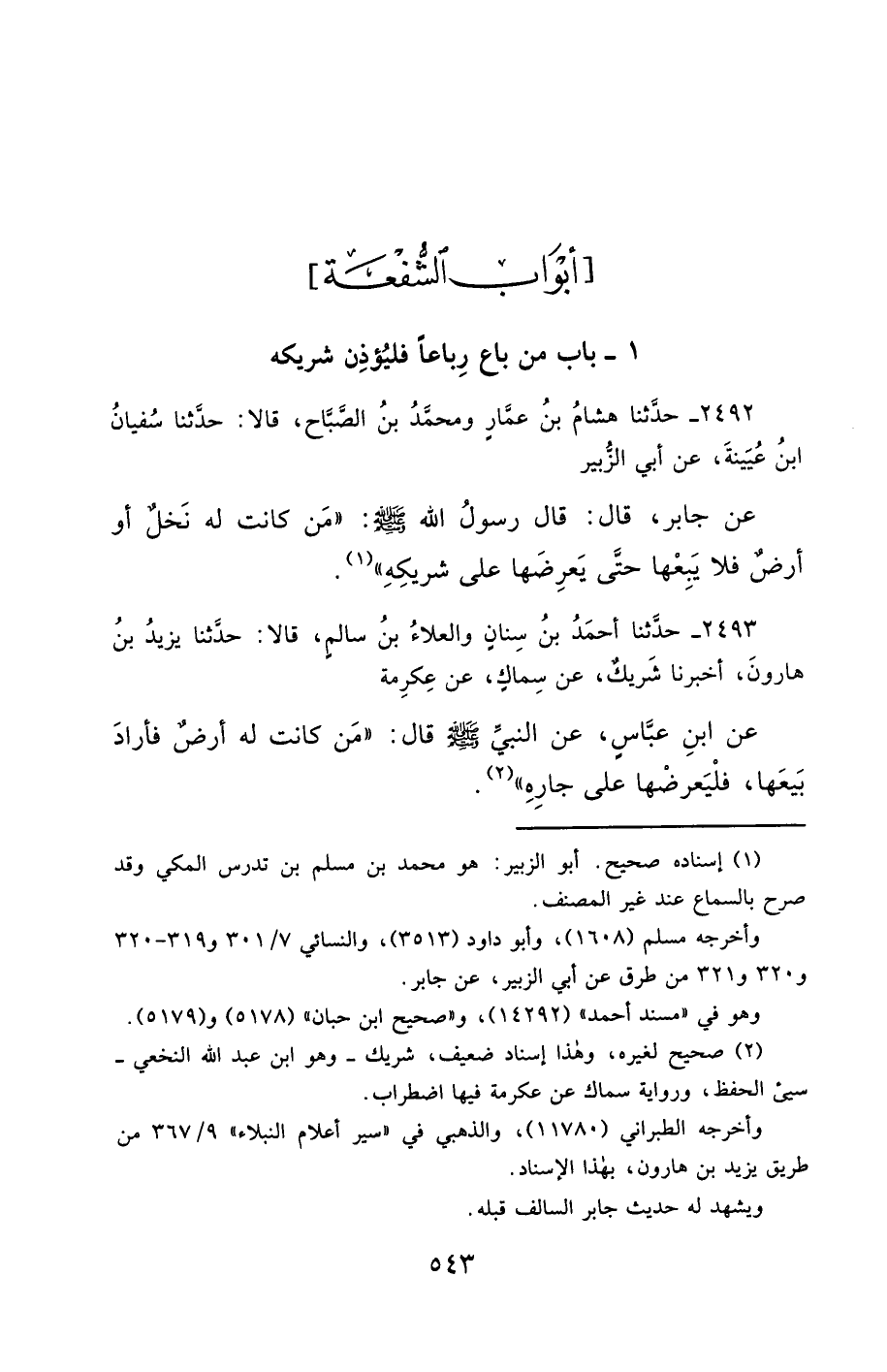 2492- حَدَّثَنَا هِشَامُ بْنُ عَمَّارٍ ، وَمُحَمَّدُ بْنُ الصَّبَّاحِ , قَالاَ : حَدَّثَنَا سُفْيَانُ بْنُ عُيَيْنَةَ ، عَنْ أَبِي الزُّبَيْرِ ، عَنْ جَابِرٍ , قَالَ : قَالَ رَسُولُ اللهِ صَلَّى الله عَليْهِ وسَلَّمَ : مَنْ كَانَتْ لَهُ نَخْلٌ أَوْ أَرْضٌ فَلاَ يَبِعْهَا ، حَتَّى يَعْرِضَهَا عَلَى شَرِيكِهِ.