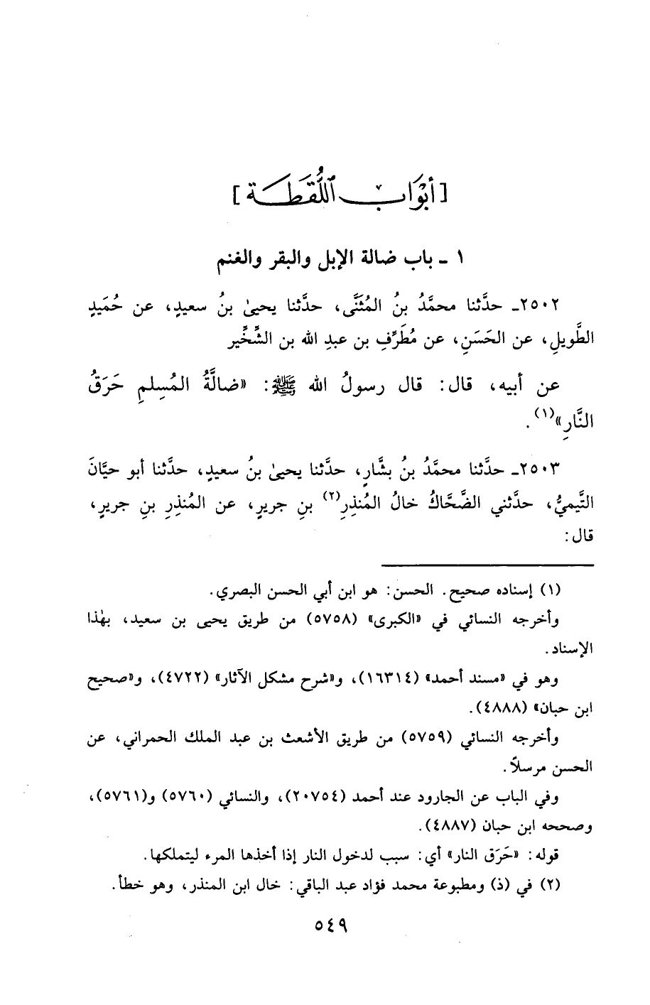 2502- حَدَّثَنَا مُحَمَّدُ بْنُ الْمُثَنَّى ، حَدَّثَنَا يَحْيَى بْنُ سَعِيدٍ ، عَنْ حُمَيْدٍ الطَّوِيلِ ، عَنِ الْحَسَنِ ، عَنْ مُطَرِّفِ بْنِ عَبْدِ اللهِ بْنِ الشِّخِّيرِ ، عَنْ أَبِيهِ , قَالَ : قَالَ رَسُولُ اللهِ صَلَّى الله عَليْهِ وسَلَّمَ : ضَالَّةُ الْمُسْلِمِ حَرَقُ النَّارِ.