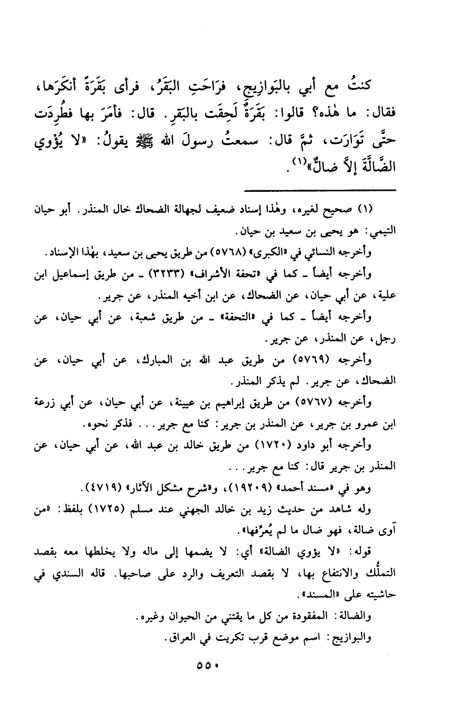كُنْتُ مَعَ أَبِي بِالْبَوَازِيجِ، فَرَاحَتْ الْبَقَرُ، فَرَأَى بَقَرَةً أَنْكَرَهَا، فَقَالَ: مَا هَذِهِ؟ قَالُوا: بَقَرَةٌ لَحِقَتْ بِالْبَقَرِ. قَالَ: فَأَمَرَ بها فَطُرِدَتْ حَتَّى تَوَارَتْ، ثُمَّ قَالَ: سَمِعْتُ رَسُولَ اللَّهِ - صَلَّى اللَّهُ عَلَيْهِ وَسَلَّمَ - يَقُولُ: "لَا يُؤْوِي الضَّالَّةَ إِلَّا ضَالٌّ" (¬1).