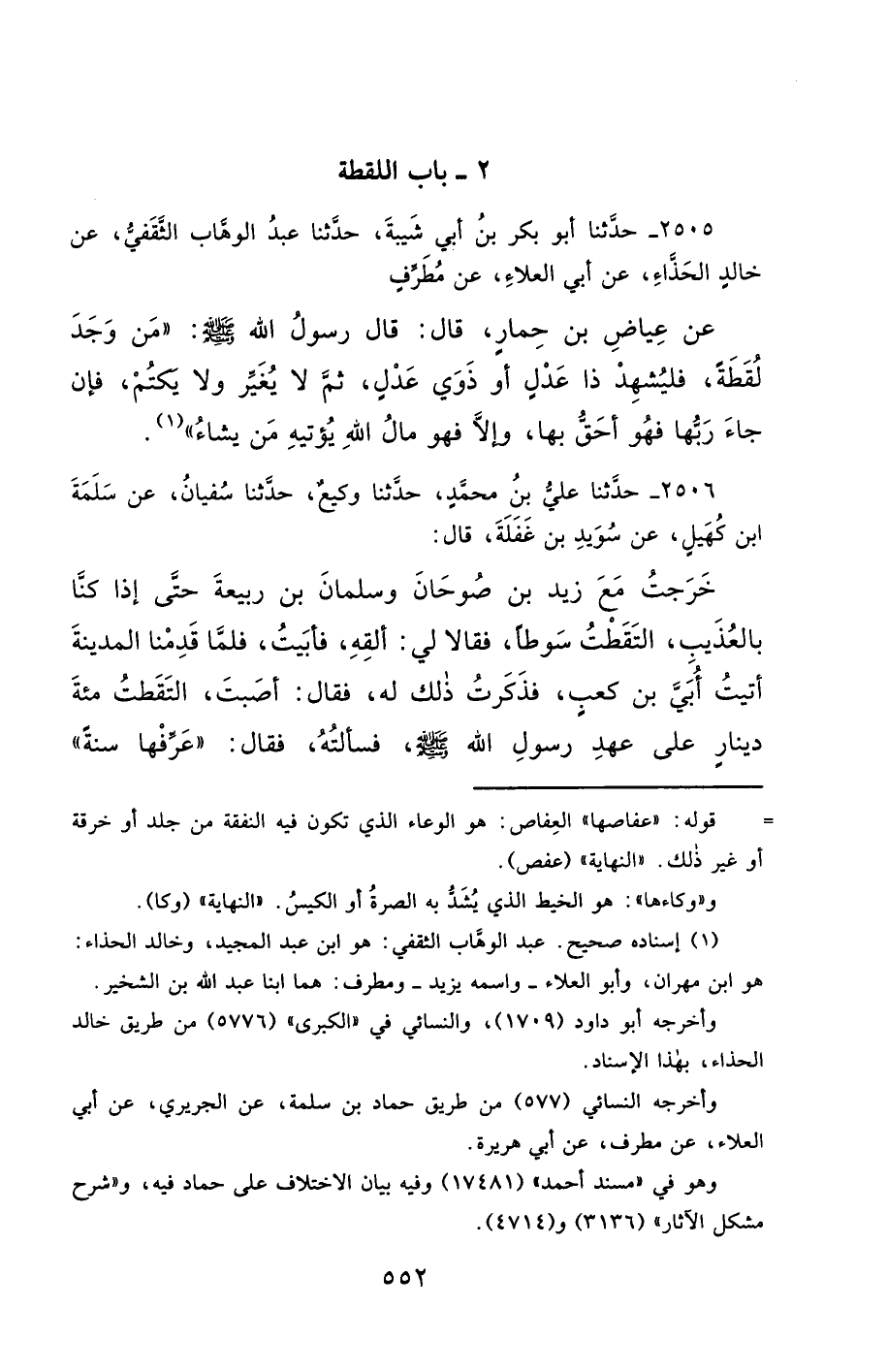 2505- حَدَّثَنَا أَبُو بَكْرِ بْنُ أَبِي شَيْبَةَ ، حَدَّثَنَا عَبْدُ الْوَهَّابِ الثَّقَفِيُّ ، عَنْ خَالِدٍ الْحَذَّاءِ ، عَنْ أَبِي الْعَلاَءِ ، عَنْ مُطَرِّفٍ ، عَنْ عِيَاضِ بْنِ حِمَارٍ , قَالَ : قَالَ رَسُولُ اللهِ صَلَّى الله عَليْهِ وسَلَّمَ : مَنْ وَجَدَ لُقَطَةً فَلْيُشْهِدْ ذَا عَدْلٍ أَوْ ذَوَيْ عَدْلٍ ، ثُمَّ لاَ يُغَيِّرْ وَلاَ يَكْتُمْ ، فَإِنْ جَاءَ رَبُّهَا ، فَهُوَ أَحَقُّ بِهَا ، وَإِلاَّ فَهُوَ مَالُ اللهِ يُؤْتِيهِ مَنْ يَشَاءُ.