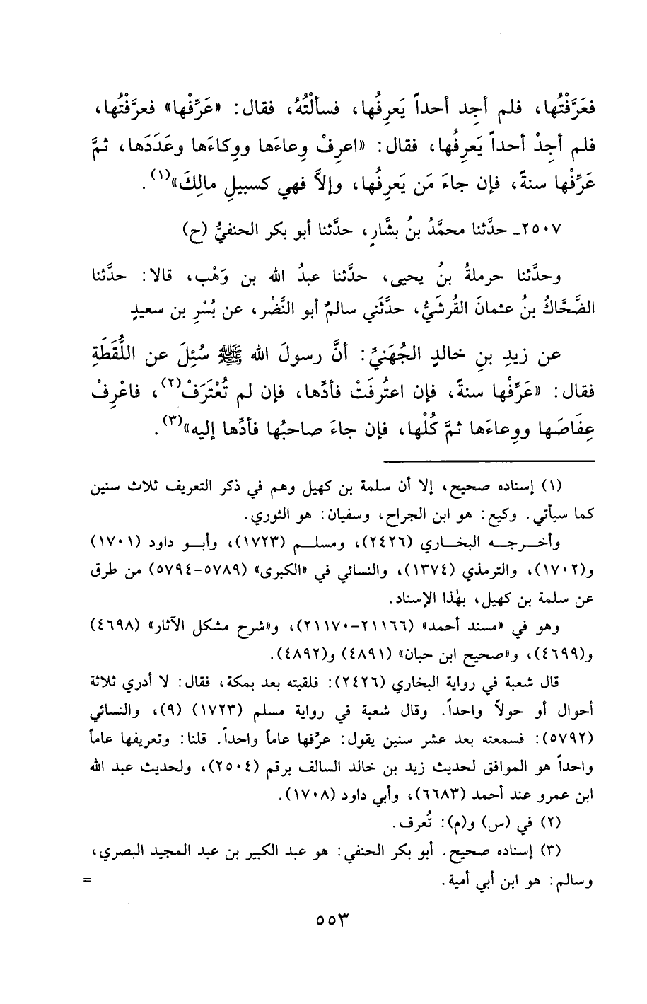 2507- حَدَّثَنَا مُحَمَّدُ بْنُ بَشَّارٍ ، حَدَّثَنَا أَبُو بَكْرٍ الْحَنَفِيُّ (ح) وحَدَّثَنَا حَرْمَلَةُ بْنُ يَحْيَى ، حَدَّثَنَا عَبْدُ اللهِ بْنُ وَهْبٍ , قَالاَ : حَدَّثَنَا الضَّحَّاكُ بْنُ عُثْمَانَ الْقُرَشِيُّ , حَدَّثَنِي سَالِمٌ أَبُو النَّضْرِ ، عَنْ بُسْرِ بْنِ سَعِيدٍ ، عَنْ زَيْدِ بْنِ خَالِدٍ الْجُهَنِيِّ ، أَنَّ رَسُولَ اللهِ صَلَّى الله عَليْهِ وسَلَّمَ سُئِلَ عَنِ اللُّقَطَةِ ، فَقَالَ : عَرِّفْهَا سَنَةً ، فَإِنِ اعْتُرِفَتْ فَأَدِّهَا ، فَإِنْ لَمْ تُعْتَرَفْ ، فَاعْرِفْ عِفَاصَهَا وَوِعَاءَهَا ، ثُمَّ كُلْهَا ، فَإِنْ جَاءَ صَاحِبُهَا فَأَدِّهَا إِلَيْهِ.