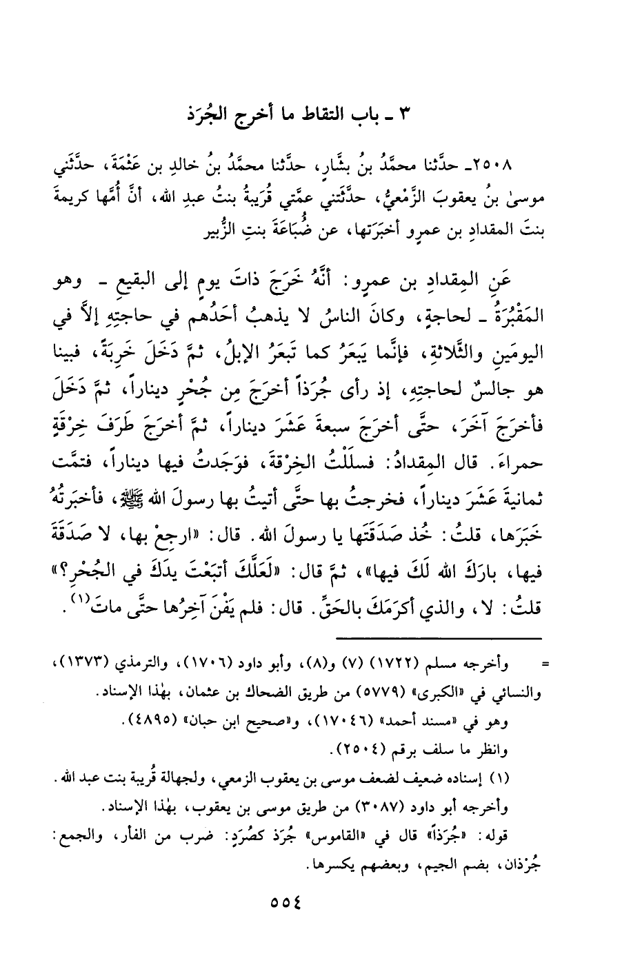 2508- حَدَّثَنَا مُحَمَّدُ بْنُ بَشَّارٍ ، حَدَّثَنَا مُحَمَّدُ بْنُ خَالِدِ بْنِ عَثْمَةَ , حَدَّثَنِي مُوسَى بْنُ يَعْقُوبَ الزَّمْعِيُّ , حَدَّثَتْنِي عَمَّتِي قُرَيْبَةُ بِنْتُ عَبْدِ اللهِ , أَنَّ أُمَّهَا كَرِيمَةَ بِنْتَ الْمِقْدَادِ بْنِ عَمْرٍو أَخْبَرَتْهَا عَنْ ضُبَاعَةَ بِنْتِ الزُّبَيْرِ ، عَنِ الْمِقْدَادِ بْنِ عَمْرٍو ، أَنَّهُ خَرَجَ ذَاتَ يَوْمٍ إِلَى الْبَقِيعِ ، وَهُوَ الْمَقْبُرَةُ لِحَاجَتِهِ ، وَكَانَ النَّاسُ لاَ يَذْهَبُ أَحَدُهُمْ فِي حَاجَتِهِ إِلاَّ فِي الْيَوْمَيْنِ وَالثَّلاَثَةِ ، فَإِنَّمَا يَبْعَرُ كَمَا تَبْعَرُ الإِبِلُ ، ثُمَّ دَخَلَ خَرِبَةً ، فَبَيْنَا هُوَ جَالِسٌ لِحَاجَتِهِ ، إِذْ رَأَى جُرَذًا أَخْرَجَ مِنْ جُحْرٍ دِينَارًا ، ثُمَّ دَخَلَ فَأَخْرَجَ آخَرَ ، حَتَّى أَخْرَجَ سَبْعَةَ عَشَرَ دِينَارًا ، ثُمَّ أَخْرَجَ طَرَفَ خِرْقَةٍ حَمْرَاءَ , قَالَ الْمِقْدَادُ : فَسَلَلْتُ الْخِرْقَةَ , فَوَجَدْتُ فِيهَا دِينَارًا ، فَتَمَّتْ ثَمَانِيَةَ عَشَرَ دِينَارًا ، فَخَرَجْتُ بِهَا , حَتَّى أَتَيْتُ بِهَا رَسُولَ اللهِ صَلَّى الله عَليْهِ وسَلَّمَ ، فَأَخْبَرْتُهُ خَبَرَهَا ، قُلْتُ : خُذْ صَدَقَتَهَا يَا رَسُولَ اللهِ ، قَالَ : ارْجِعْ بِهَا ، لاَ صَدَقَةَ فِيهَا ، بَارَكَ اللَّهُ لَكَ فِيهَا , ثُمَّ قَالَ : لَعَلَّكَ أَتْبَعْتَ يَدَكَ فِي الْجُحْرِ ؟ قُلْتُ : لاَ وَالَّذِي أَكْرَمَكَ بِالْحَقِّ , قَالَ : فَلَمْ يَفْنَ آخِرُهَا حَتَّى مَاتَ.