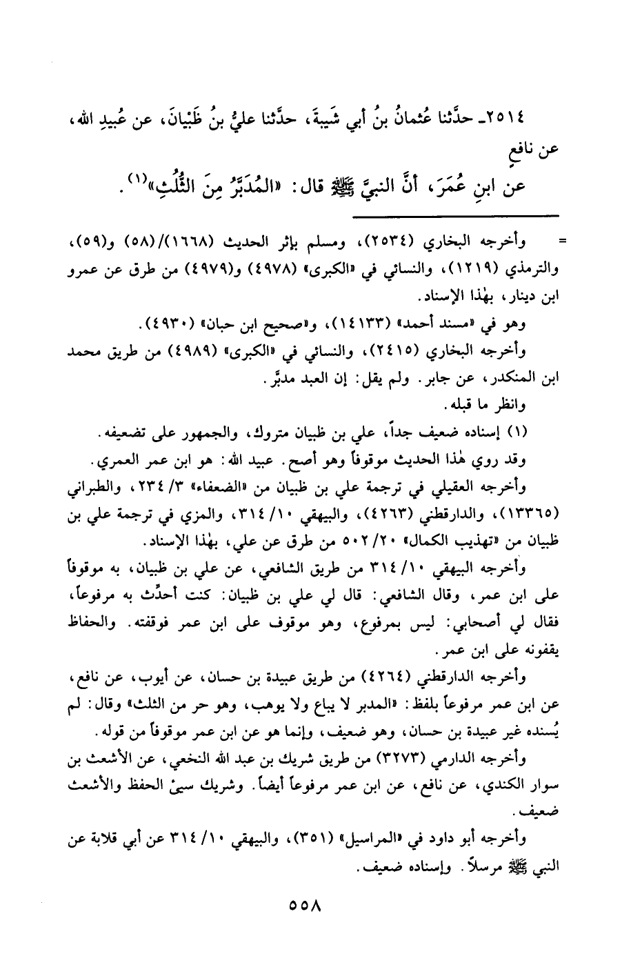 2514- حَدَّثَنَا عُثْمَانُ بْنُ أَبِي شَيْبَةَ ، حَدَّثَنَا عَلِيُّ بْنُ ظَبْيَانَ ، عَنْ عُبَيْدِ اللهِ ، عَنْ نَافِعٍ ، عَنِ ابْنِ عُمَرَ ، أَنَّ النَّبِيَّ صَلَّى الله عَليْهِ وسَلَّمَ قَالَ : الْمُدَبَّرُ مِنَ الثُّلُثِ.
