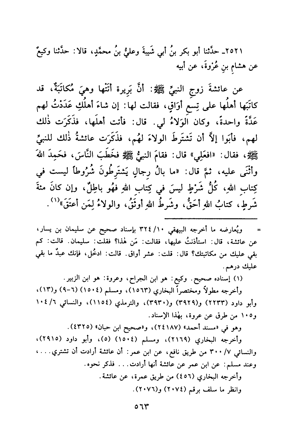 2521- حَدَّثَنَا أَبُو بَكْرِ بْنُ أَبِي شَيْبَةَ ، وَعَلِيُّ بْنُ مُحَمَّدٍ ، قَالاَ : حَدَّثَنَا وَكِيعٌ ، عَنْ هِشَامِ بْنِ عُرْوَةَ ، عَنْ أَبِيهِ ، عَنْ عَائِشَةَ , زَوْجِ النَّبِيِّ صَلَّى الله عَليْهِ وسَلَّمَ ، أَنَّ بَرِيرَةَ أَتَتْهَا وَهِيَ مُكَاتَبَةٌ قَدْ كَاتَبَهَا أَهْلُهَا عَلَى تِسْعِ أَوَاقٍ , فَقَالَتْ لَهَا : إِنْ شَاءَ أَهْلُكِ عَدَدْتُ لَهُمْ عَدَّةً وَاحِدَةً ، وَكَانَ الْوَلاَءُ لِي ، قَالَ : فَأَتَتْ أَهْلَهَا , فَذَكَرَتْ ذَلِكَ لَهُمْ فَأَبَوْا ، إِلاَّ أَنْ تَشْتَرِطَ الْوَلاَءَ لَهُمْ ، فَذَكَرَتْ عَائِشَةُ ذَلِكَ لِلنَّبِيِّ صَلَّى الله عَليْهِ وسَلَّمَ ، فَقَالَ : افْعَلِي , قَالَ : فَقَامَ النَّبِيُّ صَلَّى الله عَليْهِ وسَلَّمَ فَخَطَبَ النَّاسَ ، فَحَمِدَ اللَّهَ وَأَثْنَى عَلَيْهِ , ثُمَّ قَالَ : مَا بَالُ رِجَالٍ يَشْتَرِطُونَ شُرُوطًا لَيْسَتْ فِي كِتَابِ اللهِ , كُلُّ شَرْطٍ لَيْسَ فِي كِتَابِ اللهِ فَهُوَ بَاطِلٌ ، وَإِنْ كَانَ مِئَةَ شَرْطٍ , كِتَابُ اللهِ أَحَقُّ , وَشَرْطُ اللهِ أَوْثَقُ , وَالْوَلاَءُ لِمَنْ أَعْتَقَ.