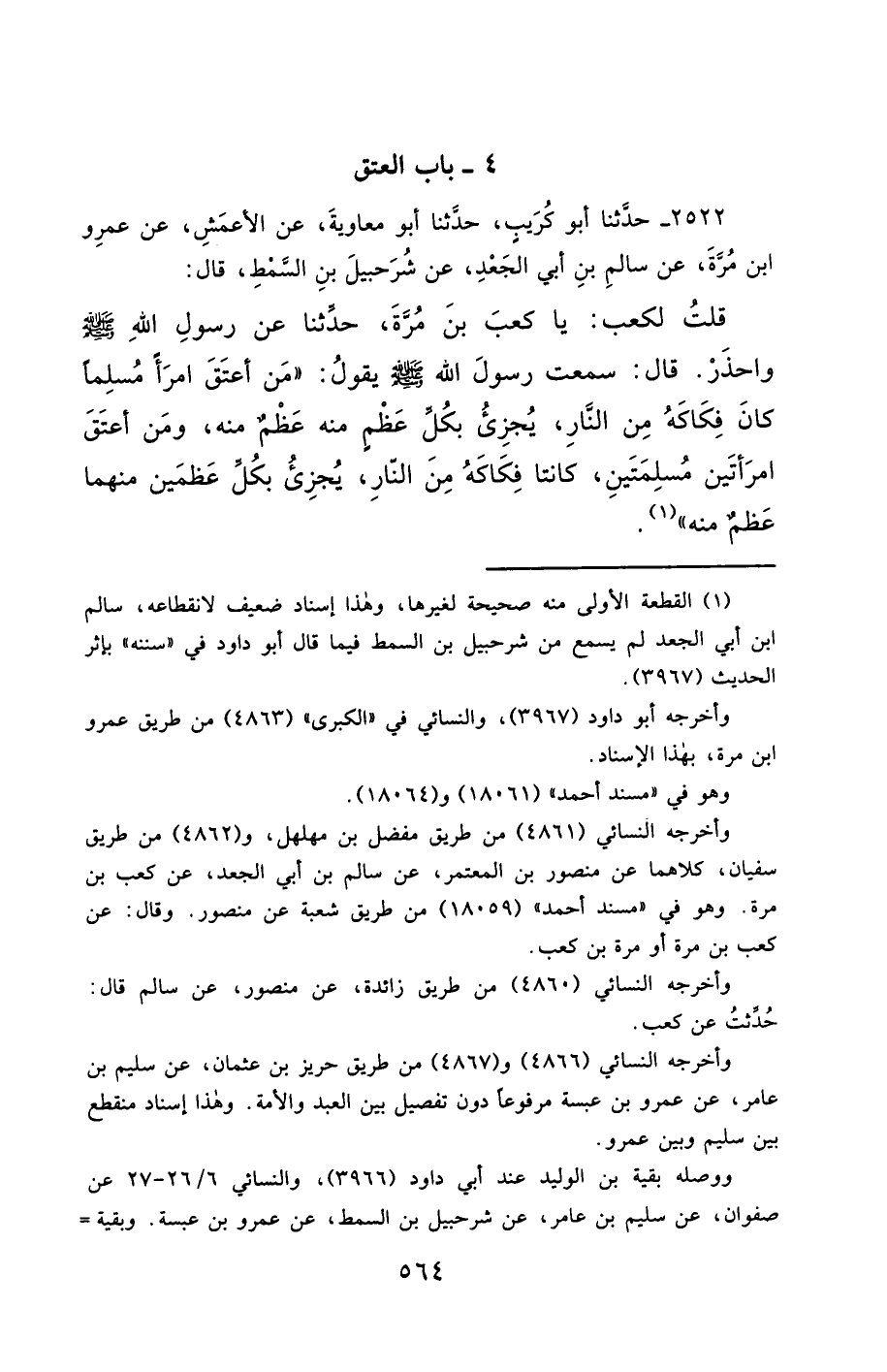 2522- حَدَّثَنَا أَبُو كُرَيْبٍ ، حَدَّثَنَا أَبُو مُعَاوِيَةَ ، عَنِ الأَعْمَشِ ، عَنْ عَمْرِو بْنِ مُرَّةَ ، عَنْ سَالِمِ بْنِ أَبِي الْجَعْدِ ، عَنْ شُرَحْبِيلَ بْنِ السِّمْطِ , قَالَ : قُلْتُ لِكَعْبٍ : يَا كَعْبَ بْنَ مُرَّةَ ، حَدِّثْنَا عَنْ رَسُولِ اللهِ صَلَّى الله عَليْهِ وسَلَّمَ وَاحْذَرْ ، قَالَ : سَمِعْتُ رَسُولَ اللهِ صَلَّى الله عَليْهِ وسَلَّمَ يَقُولُ : مَنْ أَعْتَقَ امْرَءًا مُسْلِمًا ، كَانَ فِكَاكَهُ مِنَ النَّارِ ، يُجْزِئُ بِكُلِّ عَظْمٍ مِنْهُ عَظْمٌ مِنْهُ ، وَمَنْ أَعْتَقَ امْرَأَتَيْنِ مُسْلِمَتَيْنِ ، كَانَتَا فِكَاكَهُ مِنَ النَّارِ ، يُجْزِئُ بِكُلِّ عَظْمَيْنِ مِنْهُمَا عَظْمٌ مِنْهُ.