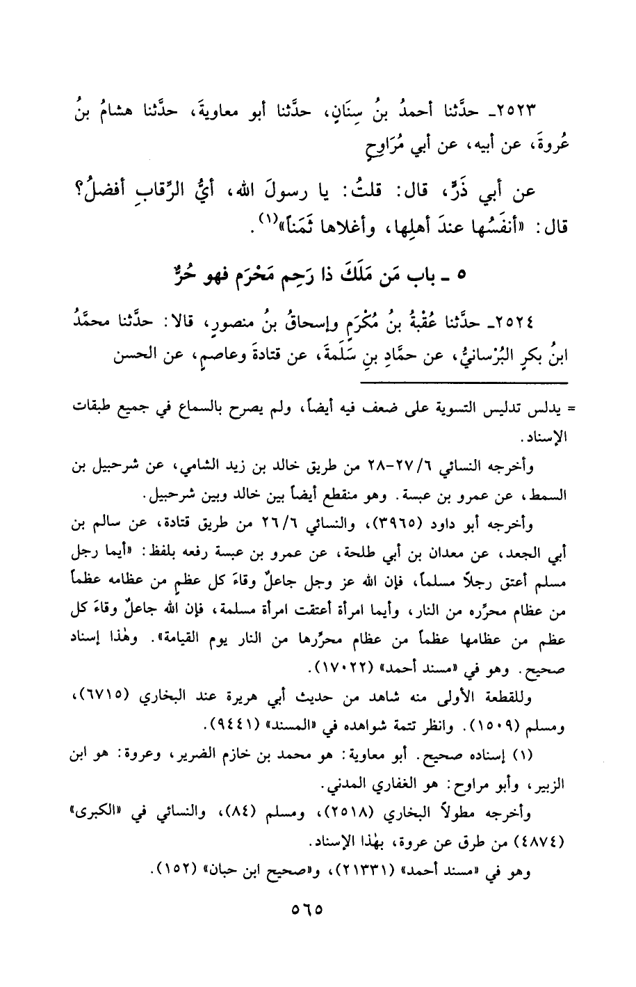 2523- حَدَّثَنَا أَحْمَدُ بْنُ سِنَانٍ ، حَدَّثَنَا أَبُو مُعَاوِيَةَ ، حَدَّثَنَا هِشَامُ بْنُ عُرْوَةَ ، عَنْ أَبِيهِ ، عَنْ أَبِي مُرَاوِحٍ ، عَنْ أَبِي ذَرٍّ , قَالَ : قُلْتُ : يَا رَسُولَ اللهِ ، أَيُّ الرِّقَابِ أَفْضَلُ ؟ قَالَ : أَنْفَسُهَا عِنْدَ أَهْلِهَا ، وَأَغْلاَهَا ثَمَنًا.