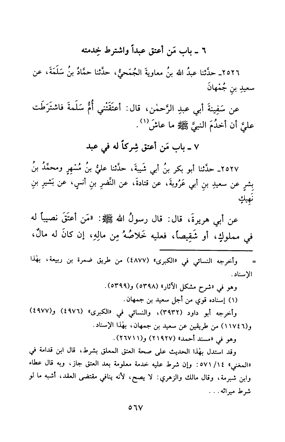 2526- حَدَّثَنَا عَبْدُ اللهِ بْنُ مُعَاوِيَةَ الْجُمَحِيُّ ، حَدَّثَنَا حَمَّادُ بْنُ سَلَمَةَ ، عَنْ سَعِيدِ بْنِ جُمْهَانَ ، عَنْ سَفِينَةَ أَبِي عَبْدِ الرَّحْمَنِ , قَالَ : أَعْتَقَتْنِي أُمُّ سَلَمَةَ , فَاشْتَرَطَتْ عَلَيَّ أَنْ أَخْدُمَ النَّبِيَّ صَلَّى الله عَليْهِ وسَلَّمَ مَا عَاشَ.