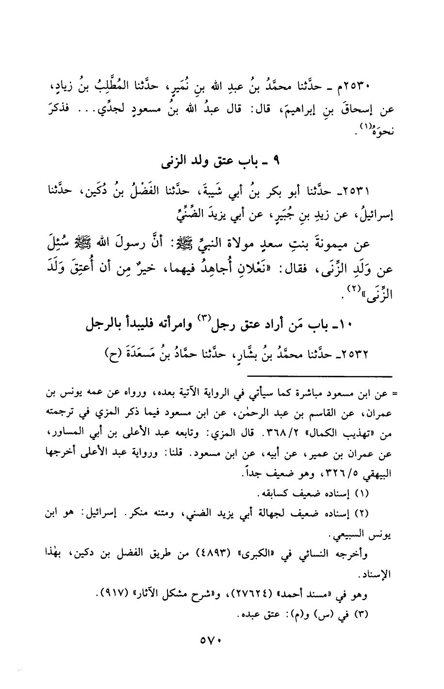 2531- حَدَّثَنَا أَبُو بَكْرِ بْنُ أَبِي شَيْبَةَ ، حَدَّثَنَا الْفَضْلُ بْنُ دُكَيْنٍ ، حَدَّثَنَا إِسْرَائِيلُ ، عَنْ زَيْدِ بْنِ جُبَيْرٍ ، عَنْ أَبِي يَزِيدَ الضِّنِّيِّ ، عَنْ مَيْمُونَةَ بِنْتِ سَعْدٍ ، مَوْلاَةِ النَّبِيِّ صَلَّى الله عَليْهِ وسَلَّمَ ، أَنَّ رَسُولَ اللهِ صَلَّى الله عَليْهِ وسَلَّمَ سُئِلَ عَنْ وَلَدِ الزِّنَا ، فَقَالَ : نَعْلاَنِ أُجَاهِدُ فِيهِمَا ، خَيْرٌ مِنْ أَنْ أُعْتِقَ وَلَدَ الزِّنَا.