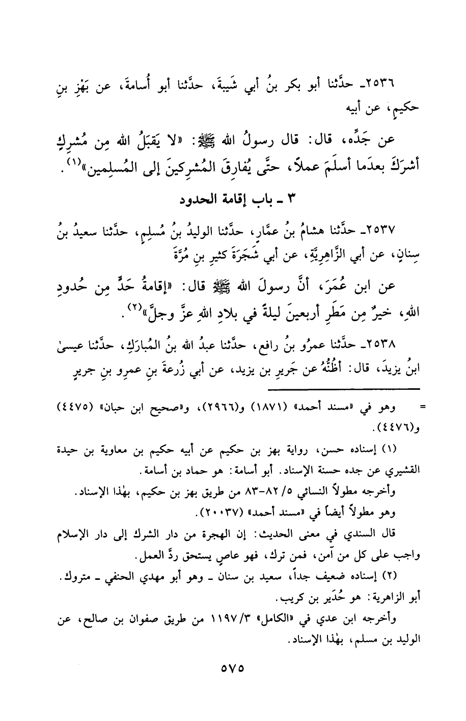 2537- حَدَّثَنَا هِشَامُ بْنُ عَمَّارٍ ، حَدَّثَنَا الْوَلِيدُ بْنُ مُسْلِمٍ ، حَدَّثَنَا سَعِيدُ بْنُ سِنَانٍ ، عَنْ أَبِي الزَّاهِرِيَّةِ ، عَنْ أَبِي شَجَرَةَ كَثِيرِ بْنِ مُرَّةَ ، عَنِ ابْنِ عُمَرَ ، أَنَّ رَسُولَ اللهِ صَلَّى الله عَليْهِ وسَلَّمَ قَالَ : إِقَامَةُ حَدٍّ مِنْ حُدُودِ اللهِ ، خَيْرٌ مِنْ مَطَرِ أَرْبَعِينَ لَيْلَةً فِي بِلاَدِ اللهِ عَزَّ وَجَلَّ.