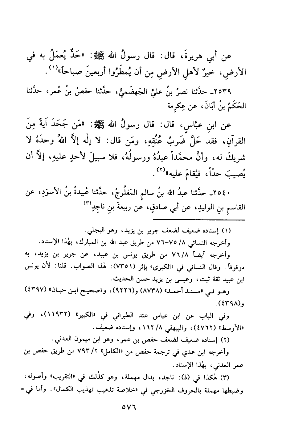 2539- حَدَّثَنَا نَصْرُ بْنُ عَلِيٍّ الْجَهْضَمِيُّ ، حَدَّثَنَا حَفْصُ بْنُ عُمَرَ ، حَدَّثَنَا الْحَكَمُ بْنُ أَبَانَ ، عَنْ عِكْرِمَةَ ، عَنِ ابْنِ عَبَّاسٍ , قَالَ : قَالَ رَسُولُ اللهِ صَلَّى الله عَليْهِ وسَلَّمَ : مَنْ جَحَدَ آيَةً مِنَ الْقُرْآنِ , فَقَدْ حَلَّ ضَرْبُ عُنُقِهِ ، وَمَنْ قَالَ : لاَ إِلَهَ إِلاَّ اللَّهُ وَحْدَهُ لاَ شَرِيكَ لَهُ ، وَأَنَّ مُحَمَّدًا عَبْدُهُ وَرَسُولُهُ , فَلاَ سَبِيلَ لأَحَدٍ عَلَيْهِ إِلاَّ أَنْ يُصِيبَ حَدًّا فَيُقَامَ عَلَيْهِ.