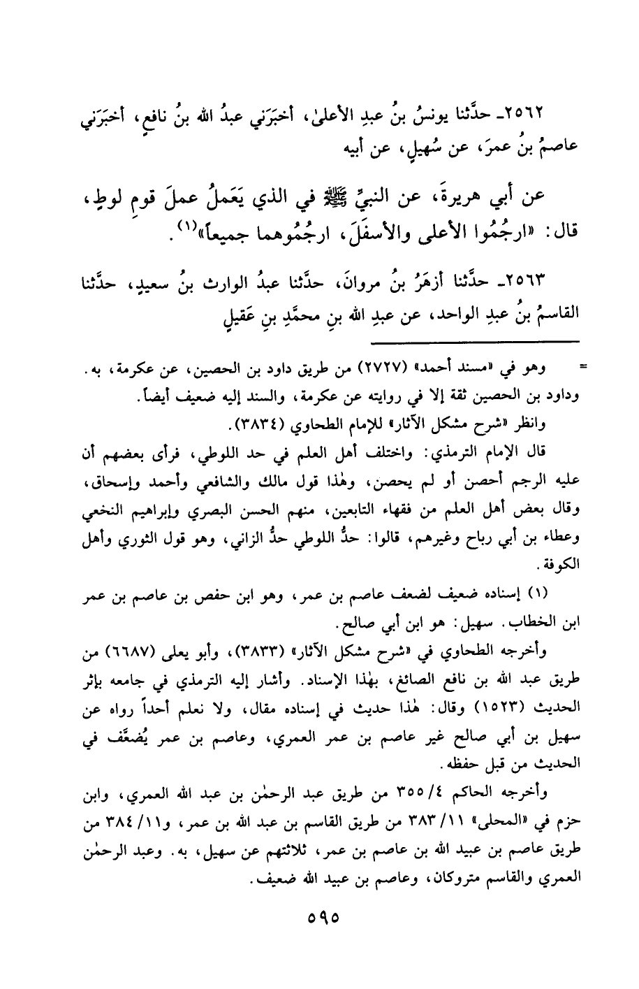 2562- حَدَّثَنَا يُونُسُ بْنُ عَبْدِ الأَعْلَى ، أَخْبَرَنِي عَبْدُ اللهِ بْنُ نَافِعٍ ، أَخْبَرَنِي عَاصِمُ بْنُ عُمَرَ ، عَنْ سُهَيْلٍ ، عَنْ أَبِيهِ ، عَنْ أَبِي هُرَيْرَةَ ، عَنِ النَّبِيِّ صَلَّى الله عَليْهِ وسَلَّمَ ؛ فِي الَّذِي يَعْمَلُ عَمَلَ قَوْمِ لُوطٍ , قَالَ : ارْجُمُوا الأَعْلَى وَالأَسْفَلَ ، ارْجُمُوهُمَا جَمِيعًا.