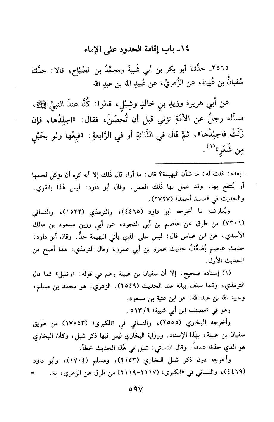2565- حَدَّثَنَا أَبُو بَكْرِ بْنُ أَبِي شَيْبَةَ ، وَمُحَمَّدُ بْنُ الصَّبَّاحِ , قَالاَ : حَدَّثَنَا سُفْيَانُ بْنُ عُيَيْنَةَ ، عَنِ الزُّهْرِيِّ ، عَنْ عُبَيْدِ اللهِ بْنِ عَبْدِ اللهِ ، عَنْ أَبِي هُرَيْرَةَ ، وَزَيْدِ بْنِ خَالِدٍ ، وَشِبْلٍ , قَالُوا : كُنَّا عِنْدَ النَّبِيِّ صَلَّى الله عَليْهِ وسَلَّمَ , فَسَأَلَهُ رَجُلٌ عَنِ الأَمَةِ تَزْنِي قَبْلَ أَنْ تُحْصَنَ ، فَقَالَ : اجْلِدْهَا ، فَإِنْ زَنَتْ فَاجْلِدْهَا , ثُمَّ قَالَ فِي الثَّالِثَةِ أَوْ فِي الرَّابِعَةِ : فَبِعْهَا وَلَوْ بِحَبْلٍ مِنْ شَعَرٍ.