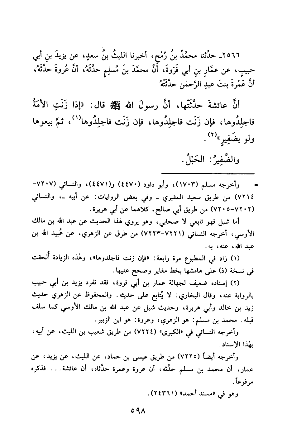 2566- حَدَّثَنَا مُحَمَّدُ بْنُ رُمْحٍ ، أَخْبَرَنَا اللَّيْثُ بْنُ سَعْدٍ ، عَنْ يَزِيدَ بْنِ أَبِي حَبِيبٍ ، عَنْ عَمَّارِ بْنِ أَبِي فَرْوَةَ ، أَنَّ مُحَمَّدَ بْنَ مُسْلِمٍ حَدَّثَهُ , أَنَّ عُرْوَةَ حَدَّثَهُ ، أَنَّ عَمْرَةَ بِنْتَ عَبْدِ الرَّحْمَنِ حَدَّثَتْهُ ، أَنَّ عَائِشَةَ حَدَّثَتْهَا , أَنَّ رَسُولَ اللهِ صَلَّى الله عَليْهِ وسَلَّمَ قَالَ : إِذَا زَنَتِ الأَمَةُ فَاجْلِدُوهَا ، فَإِنْ زَنَتْ فَاجْلِدُوهَا ، فَإِنْ زَنَتْ فَاجْلِدُوهَا ، ثُمَّ بِيعُوهَا وَلَوْ بِضَفِيرٍ.