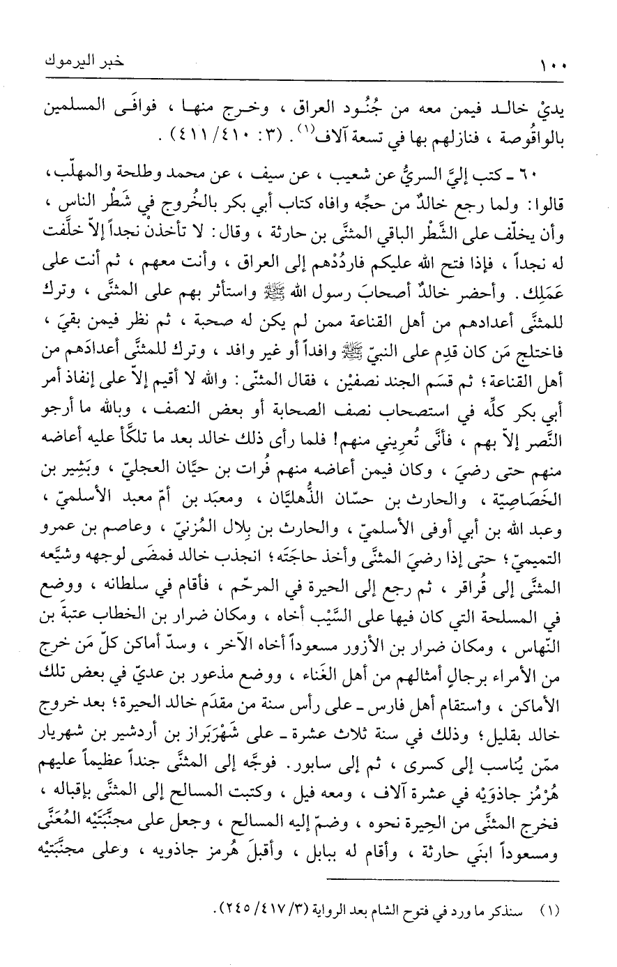 ٦٠ - كتب إليَّ السريُّ عن شعيب، عن سيف، عن محمد وطلحة والمهلّب، قالوا: ولما رجع خالدٌ من حجِّه وافاه كتاب أبي بكر بالخُروج في شَطْر الناس، وأن يخلّف على الشَّطْر الباقي المثنَّى بن حارثة، وقال: لا تأخذنْ نجدًا إلّا خلَّفت له نجدًا، فإذا فتح الله عليكم فاردُدْهم إلى العراق، وأنت معهم، ثم أنت على عَمَلِك. وأحضر خالدٌ أصحابَ رسول الله - صلى الله عليه وسلم - واستأثر بهم على المثنَّى، وترك للمثنَّى أعدادهم من أهل القناعة ممن لم يكن له صحبة، ثم نظر فيمن بقيَ، فاختلج مَن كان قدِم على النبيّ - صلى الله عليه وسلم - وافدًا أو غير وافد، وترك للمثنَّى أعدادَهم من أهل القناعة، ثم قسَم الجند نصفين، فقال المثنّى: والله لا أقيم إلّا على إنفاذ أمر أبي بكر كلِّه في استصحاب نصف الصحابة أو بعض النصف، وبالله ما أرجو النَّصر إلّا بهم، فأنَّى تُعرِيني منهم! فلما رأى ذلك خالد بعد ما تلكَّأ عليه أعاضه منهم حتى رضيَ، وكان فيمن أعاضه منهم فُرات بن حيَّان العجليّ، وبَشِير بن الخَصَاصِيّة، والحارث بن حسّان الذُّهليَّان، ومعبَد بن أمّ معبد الأسلميّ، وعبد الله بن أبي أوفى الأسلميّ، والحارث بن بِلال المُزنيّ، وعاصم بن عمرو التميميّ؛ حتى إذا رضيَ المثنَّى وأخذ حاجَتَه؛ انجذب خالد فمضَى لوجهه وشيَّعه المثنَى إلى قُراقر، ثم رجع إلى الحيرة في المرحّم، فأقام في سلطانه، ووضع في المسلحة التي كان فيها على السَّيب أخاه، ومكان ضرار بن الخطاب عتبةَ بن النّهاس، ومكان ضرار بن الأزور مسعودًا أخاه الآخر، وسدّ أماكن كل مَن خرج من الأمراء برجالٍ أمثالهم من أهل الغَناء، ووضع مذعور بن عديّ في بعض تلك الأماكن، وأستقام أهل فارس - على رأس سنة من مقدَم خالد الحيرة، بعد خروج خالد بقليل؛ وذلك في سنة ثلاث عشرة - على شَهْرَبَراز بن أردشير بن شهريار ممّن يُناسب إلى كسرى، ثم إلى سابور. فوجَّه إلى المثنَّى جندًا عظيمًا عليهم هُرْمُز جاذوَيه في عشرة آلاف، ومعه فيل، وكتبت المسالح إلى المثنَّى بإقباله، فخرج المثنَّى من الحِيرة نحوه، وضمّ إليه المسالح، وجعل على مجنَّبَتَيه المُعَنَّى ومسعودًا ابنَي حارثة، وأقام له ببابل، وأقبلَ هُرمز جاذويه، وعلى مجنَّبَتيه