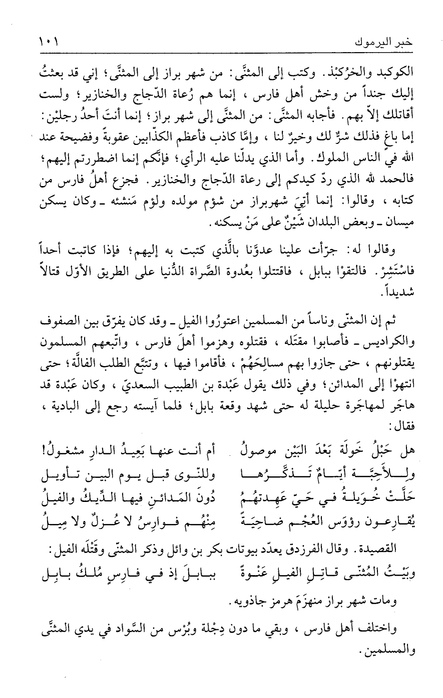 الكوكبد والخرُكبْذ. وكتب إلى المثنَّى: من شهر براز إلى المثنَّى؛ إني قد بعثتُ إليك جندًا من وخش أهل فارس، إنما هم رُعاة الدّجاج والخنازير؛ ولست أقاتلك إلّا بهم. فأجابه المثنَّى: من المثنَّى إلى شهر براز؛ إنما أنتَ أحدُ رجلين: إما باغٍ فذلك شرٌّ لك وخيرٌ لنا، وإمَّا كاذب فأعظم الكذّابين عقوبةً وفضيحة عند الله في الناس الملوك. وأما الذي يدلّنا عليه الرأي؛ فإنَّكم إنما اضطررتم إليهم؛ فالحمد لله الذي ردّ كيدكم إلى رعاة الدّجاج والخنازير. فجزع أهلُ فارس من كتابه، وقالوا: إنما أتِيَ شهربراز من شؤم مولده ولؤم مَنشئه - وكان يسكن ميسان - وبعض البلدان شَينٌ على مَنْ يسكنه.