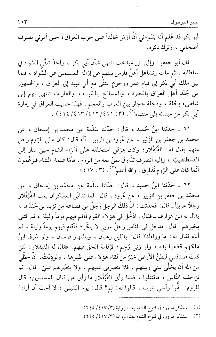 ٦١ - حدَّثنا ابنُ حُميد، قال: حدَّثنا سَلَمة عن محمد بن إسحاق، عن محمد بن جعفر بن الزُّبَير، عن عُروة بن الزبير: أنَّه قال: كان على الرّوم رجل منهم يقال له: القُبُقْلار؛ وكان هِرَقل استخلفه على أمَرَاء الشام حين سار إلى القسطنطينيّة، وإليه انصرف تذَارق بمنْ معه من الروم. فأمّا علماء الشام فيزعُمون أنّما كان على الرّوم تَذارِق. والله أعلم (٢). (٣: ٤١٧).