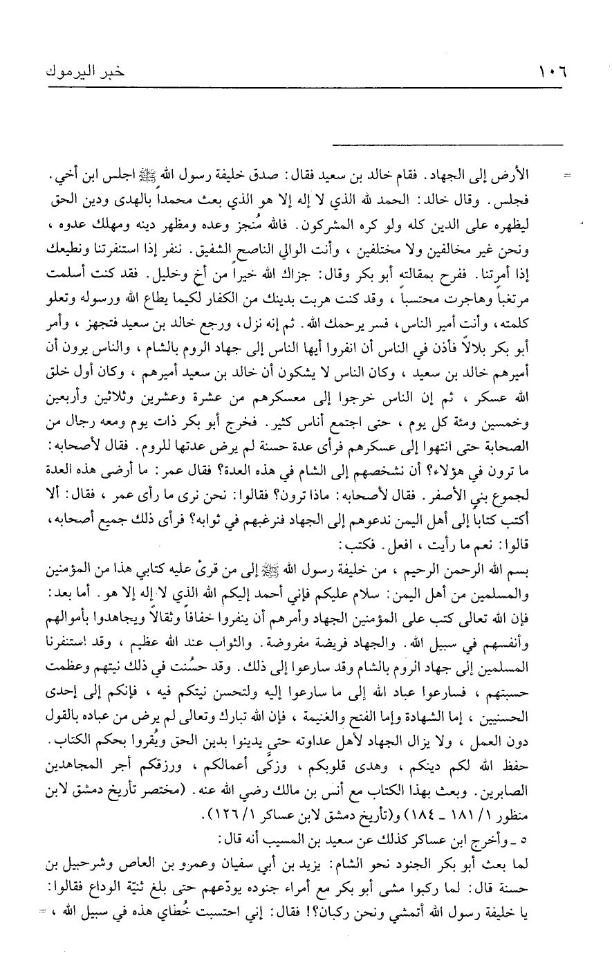بسم الله الرحمن الرحيم، من خليفة رسول الله - صلى الله عليه وسلم - إلى من قرئ عليه كتابي هذا من المؤمنين والمسلمين من أهل اليمن: سلام عليكم فإني أحمد إليكم الله الذي لا إله إلا هو. أما بعد: فإن الله تعالى كتب على المؤمنين الجهاد وأمرهم أن ينفروا خفافًا وثقالًا ويجاهدوا بأموالهم وأنفسهم في سبيل الله. والجهاد فريضة مفروضة. والثواب عند الله عظيم، وقد استنفرنا المسلمين إلى جهاد الروم بالشام وقد سارعوا إلى ذلك. وقد حسُنت في ذلك نيتهم وعظمت حسبتيهم، فسارعوا عباد الله إلى ما سارعوا إليه ولتحسن نيتكم فيه، فإنكم إلى إحدى الحسنيين، إما الشهادة وإما الفتح والغنيمة، فإن الله تبارك وتعالى لم يرض من عباده بالقول دون العمل، ولا يزال الجهاد لأهل عداوته حتى يدينوا بدين الحق ويُقروا بحكم الكتاب. حفظ الله لكم دينكم، وهدى قلوبكم، وزكَّى أعمالكم، ورزقكم أجر المجاهدين الصابرين. وبعث بهذا الكتاب مع أنس بن مالك رضي الله عنه. (مختصر تأريخ دمشق لابن منظور ١/ ١٨١ - ١٨٤) و (تاريخ دمشق لابن عساكر ١/ ١٢٦).