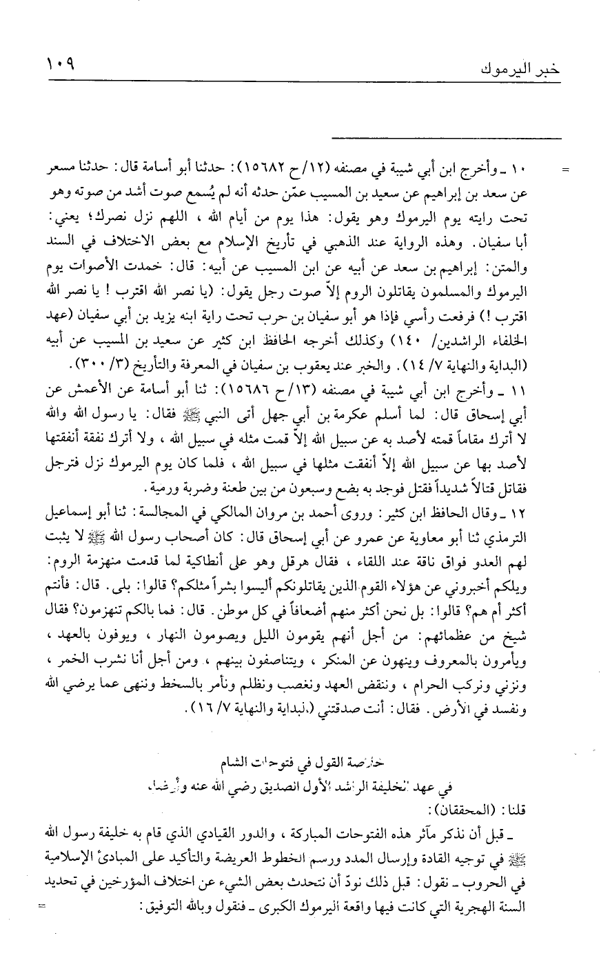 = ١٠ - وأخرج ابن أبي شيبة في مصنفه (١٢ / ح ١٥٦٨٢): حدثنا أبو أسامة قال: حدثنا مسعر عن سعد بن إبراهيم عن سعيد بن المسيب عمّن حدثه أنه لم يُسمع صوت أشد من صوته وهو تحت رايته يوم اليرموك وهو يقول: هذا يوم من أيام الله، اللهم نزل نصرك؛ يعني: أبا سفيان. وهذه الرواية عند الذهبي في تأريخ الإسلام مع بعض الاختلاف في المسند والمتن: إبراهيم بن سعد عن أبيه عن ابن المسيب عن أبيه: قال: خمدت الأصوات يوم اليرموك والمسلمون يقاتلون الروم إلّا صوت رجل يقول: (يا نصر الله اقترب! يا نصر الله اقترب! ) فرفعت رأسي فإذا هو أبو سفيان بن حرب تحت راية ابنه يزيد بن أبي سفيان (عهد الخلفاء الراشدين / ١٤٠) وكذلك أخرجه الحافظ ابن كثير عن سعيد بن المسيب عن أبيه (البداية والنهاية ٧/ ١٤). والخبر عند يعقوب بن سفيان في المعرفة والتأربخ (٣/ ٣٠٠).