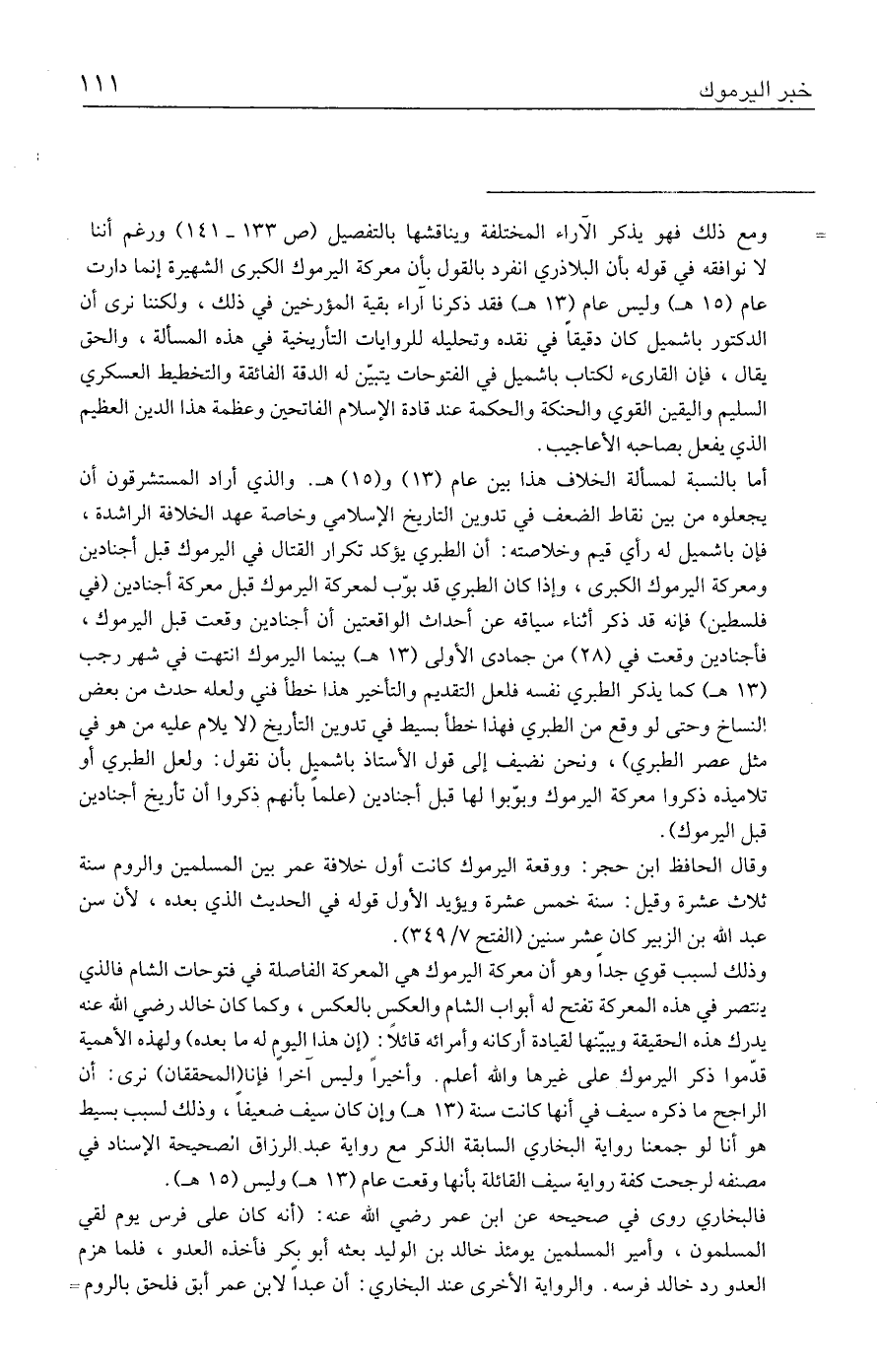 = ومع ذلك فهو يذكر الآراء المختلفة ويناقشها بالتفصيل (ص ١٣٣ - ١٤١) ورغم أننا لا نوافقه في قوله بأن البلاذري انفرد بالقول بأن معركة اليرموك الكبرى الشهيرة إنما دارت عام (١٥ هـ) وليس عام (١٣ هـ) فقد ذكرنا آراء بقية المؤرخين في ذلك، ولكننا نرى أن الدكتور باشميل كان دقيقًا في نقده وتحليله للروايات التأريخية في هذه المسألة، والحق يقال، فإن القارئ لكتاب باشميل في الفتوحات يتبيّن له الدقة الفائقة والتخطيط العسكري السليم واليقين القوي والحنكة والحكمة عند قادة الإسلام الفاتحين وعظمة هذا الدين العظيم الذي يفعل بصاحبه الأعاجيب.