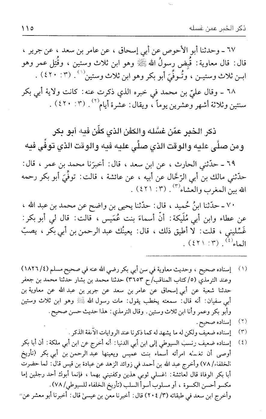 ٧٠ - حدَّثنا ابنُ حُميد، قال: حدَّثنا يحيى بن واضح عن محمد بن عبد الله، عن عطاء وابن أبي مُلَيكة: أنّ أسماءَ بنت عُمَيس، قالت: قال لي أبو بكر: غَسِّليني، قلت: لا أطيق ذلك، قال: يعينُك عبد الرحمن بن أبي بكر، يصبّ الماء (٤). (٣: ٤٢١).