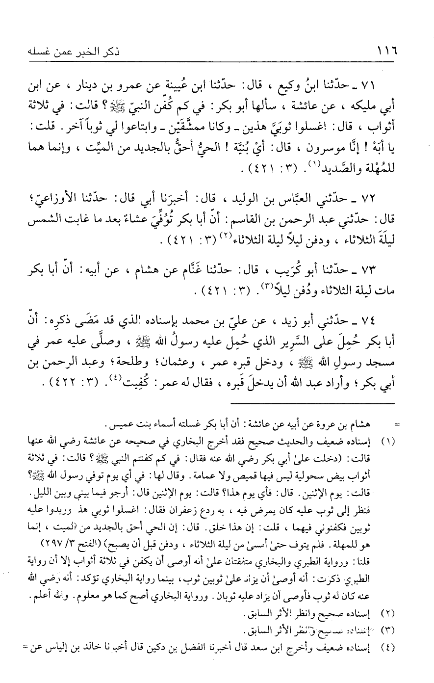 ٧٣ - حدَّثنا أبو كُرَيب، قال: حدَّثنا غَنَّام عن هشام، عن أبيه: أنّ أبا بكر مات ليلة الثلاثاء ودُفن ليلًا (٣). (٣: ٤٢١).