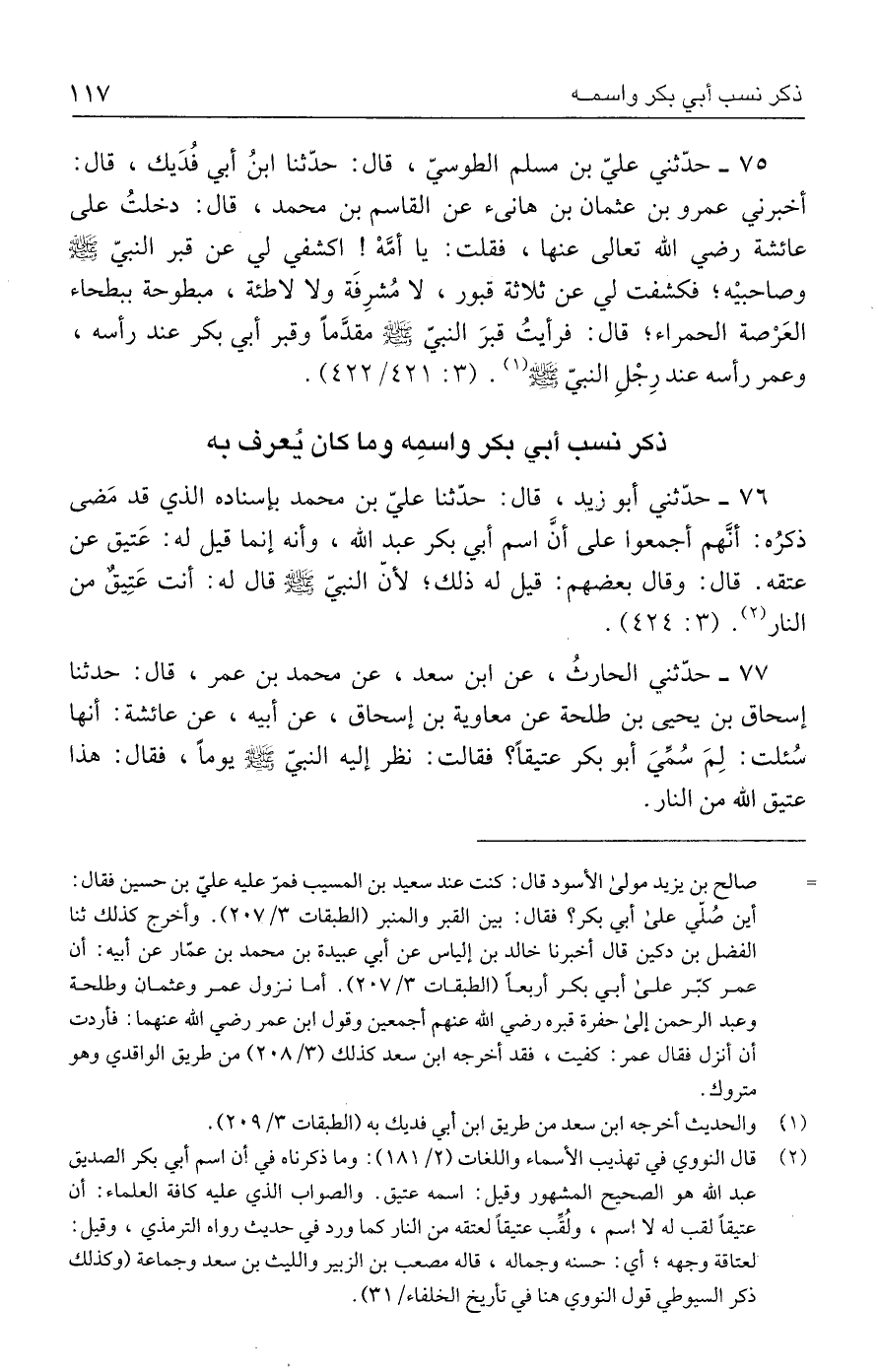 ٧٦ - حدّثني أبو زيد، قال: حدَّثنا عليّ بن محمد بإسناده الذي قد مَضى ذكرُه: أنَّهم أجمعوا على أن اسم أبي بكر عبد الله، وأنه إنما قيل له: عَتيق عن عتقه. قال: وقال بعضهم: قيل له ذلك، لأنّ النبيّ - صلى الله عليه وسلم - قال له: أنت عَتِيقٌ من النار (٢). (٣: ٤٢٤).