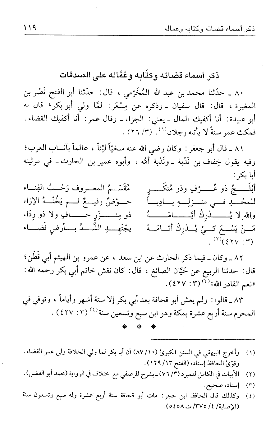 ٨١ - قال أبو جعفر: وكان رضي الله عنه سخيًّا ليِّنًا، عالمًا بأنساب العرب؛ وفيه يقول خِفاف بن نَدْبة -ونَدْبة أمُّه، وأبوه عمير بن الحارث- في مرثيته أبا بكر: