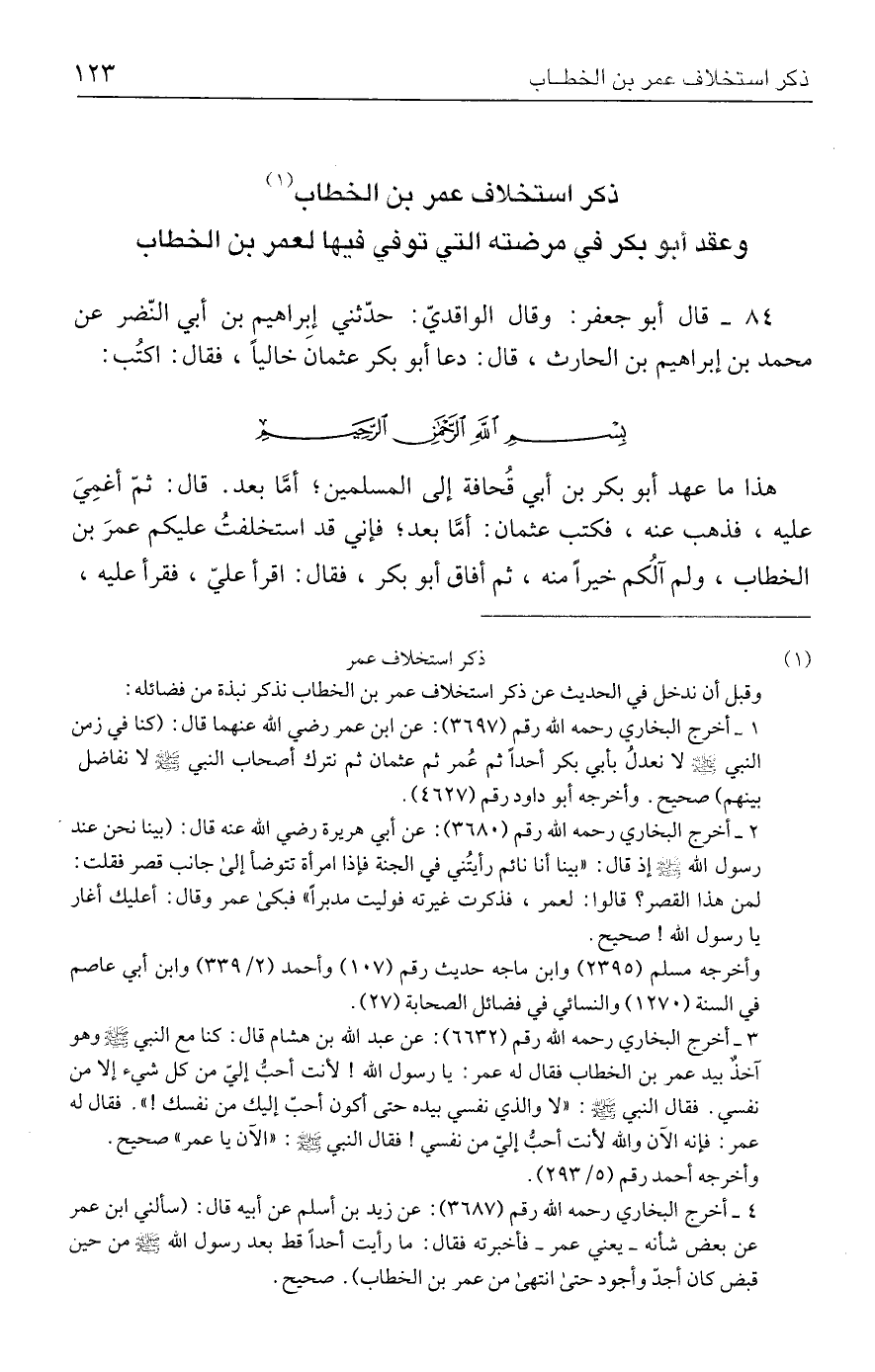 ٨٤ - قال أبو جعفر: وقال الواقديّ: حدّثني إبراهيم بن أبي النّضر عن محمد بن إبراهيم بن الحارث، قال: دعا أبو بكر عثمان خاليًا، فقال: اكتُب:
