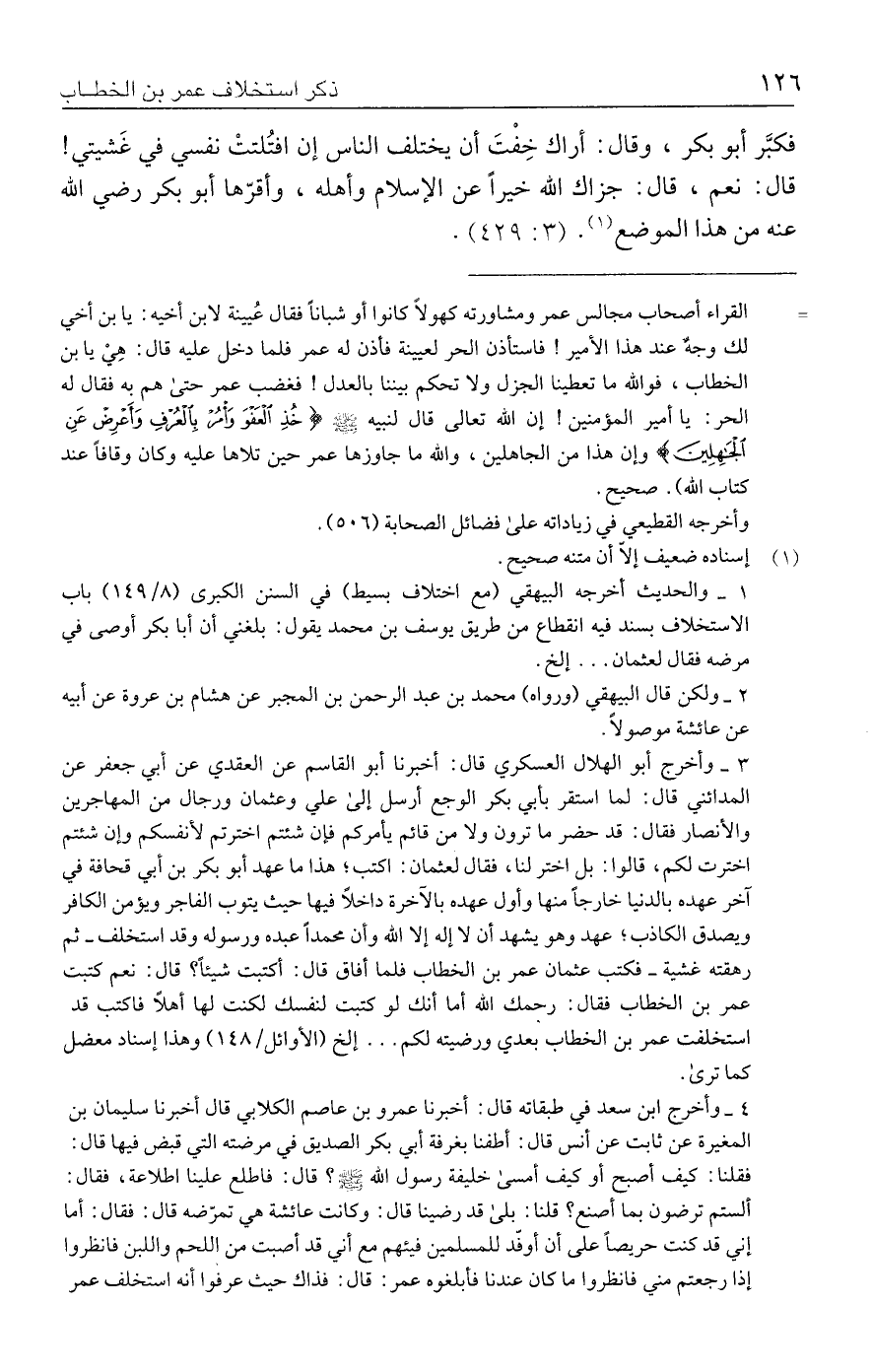 فكبَّر أبو بكر، وقال: أراك خِفْتَ أن يختلف الناس إن افتُلتتْ نفسي في غَشيتي! قال: نعم، قال: جزاك الله خيرًا عن الإسلام وأهله، وأقرّها أبو بكر رضي الله عنه من هذا الموضع (١). (٣: ٤٢٩).