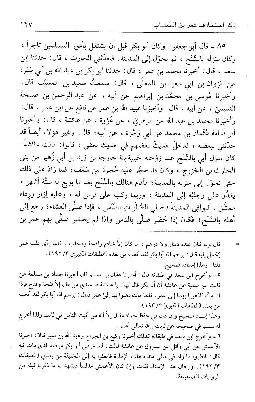 ٦ - وأخرج ابن سعد في طبقاته كذلك أخبرنا وكيع بن الجراح وعبد الله بن نمير قالا: أخبرنا الأعمش عن أبي وائل عن مسروق عن عائشة قالت: لما مرض أبو بكر مرضه الذي مات فيه قال: انظروا ما زاد في مالي منذ دخلت الإمارة فابعثوا به إلى الخليفة من بعدي (الطبقات ٣/ ١٩٢). ورجال هذا الإسناد ثقات وإن كان الأعمش مدلسًا فيشهد له ما ذكرنا قبله من الروايات الصحيحة.