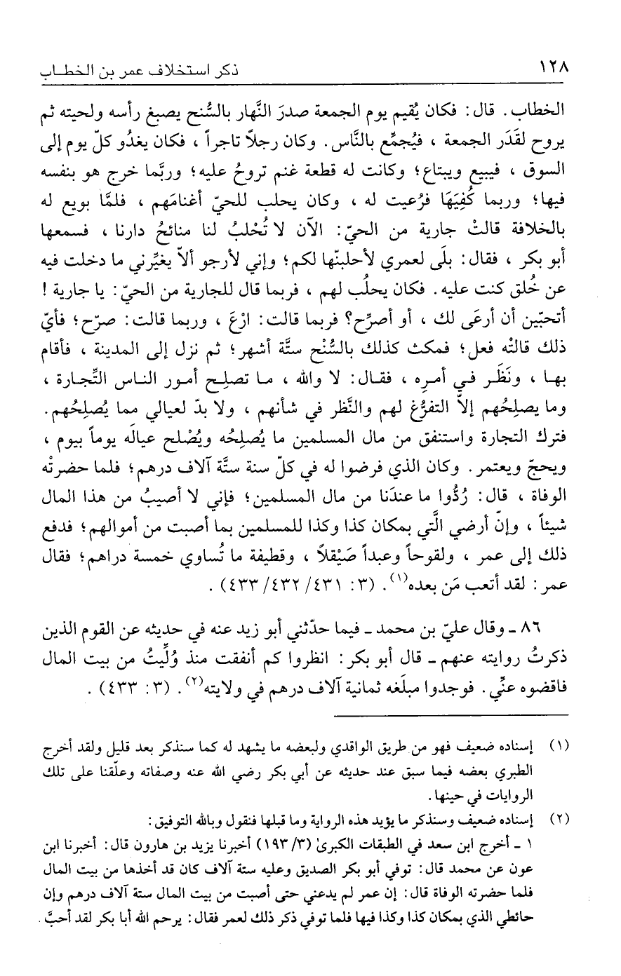 الخطاب. قال: فكان يُقيم يوم الجمعة صدرَ النَّهار بالسُّنح يصبغ رأسه ولحيته ثم يروح لقَدَر الجمعة، فيُجمِّع بالنَّاس. وكان رجلًا تاجرًا، فكان يغدُو كلّ يوم إلى السوق، فيبيع ويبتاع؛ وكانت له قطعة غنم تروحُ عليه؛ وربَّما خرج هو بنفسه فيها؛ وربما كُفِيَهَا فرُعيت له، وكان يحلب للحيّ أغنامَهم، فلمَّا بويع له بالخلافة قالتْ جارية من الحيّ: الآن لا تُحْلبُ لنا منائحُ دارنا، فسمعها أبو بكر، فقال: بلَى لعمري لأحلبنّها لكم؛ وإني لأرجو ألّا يغيِّرني ما دخلت فيه عن خُلق كنت عليه. فكان يحلُب لهم، فربما قال للجارية من الحيّ: يا جارية! أتحبّين أن أرعَى لك، أو أصرِّح؟ فربما قالت: ارْعَ، وربما قالت: صرّح؛ فأيّ ذلك قالتْه فعل؛ فمكث كذلك بالسُّنْح ستَّة أشهر؛ ثم نزل إلى المدينة، فأقام بها، ونَظَر في أمرِه، فقال: لا والله، ما تصلِح أمور الناس التِّجارة، وما يصلِحُهم إلّا التفرُّغ لهم والنَّظر في شأنهم، ولا بدّ لعيالي مما يُصلِحُهم. فترك التجارة واستنفق من مال المسلمين ما يُصلِحُه ويُصْلح عياله يومًا بيوم، ويحجّ ويعتمر. وكان الذي فرضوا له في كلّ سنة ستَّة آلاف درهم؛ فلما حضرتْه الوفاة، قال: ردُّوا ما عندَنا من مال المسلمين؛ فإني لا أصيبُ من هذا المال شيئًا، وإنّ أرضي الَّتي بمكان كذا وكذا للمسلمين بما أصبت من أموالهم؛ فدفع ذلك إلى عمر، ولقوحًا وعبدًا صَيقلًا، وقطيفة ما تُساوي خمسة دراهم؛ فقال عمر: لقد أتعب مَن بعده (١). (٣: ٤٣١/ ٤٣٢ / ٤٣٣).