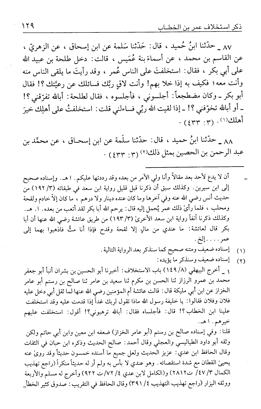 ٨٧ - حدَّثنا ابنُ حُميد، قال: حَدّثنا سَلمة عن ابن إسحاق، عن الزهريّ، عن القاسم بن محمد، عن أسماءَ بنة عُمَيس، قالت: دخل طلحة بن عبيد الله على أبي بكر، فقال: استخلفتَ على الناس عُمر، وقد رأيتَ ما يلقى الناس منه وأنت معه؛ فكيف به إذا خلا بهم! وأنت لاقٍ ربَّك فسائلك عن رعيَّتك؟ ! فقال أبو بكر -وكان مضطجعًا: أجلسوني، فأجلسوه، فقال لطلحة: أبالله تفرّقني؟ ! -أو أبالله تخوّفني؟ ! - إذا لقيت الله ربِّي فساءلني قلت: استخلفتُ على أهلِك خيرَ أهلك (١). (٣: ٤٣٣).