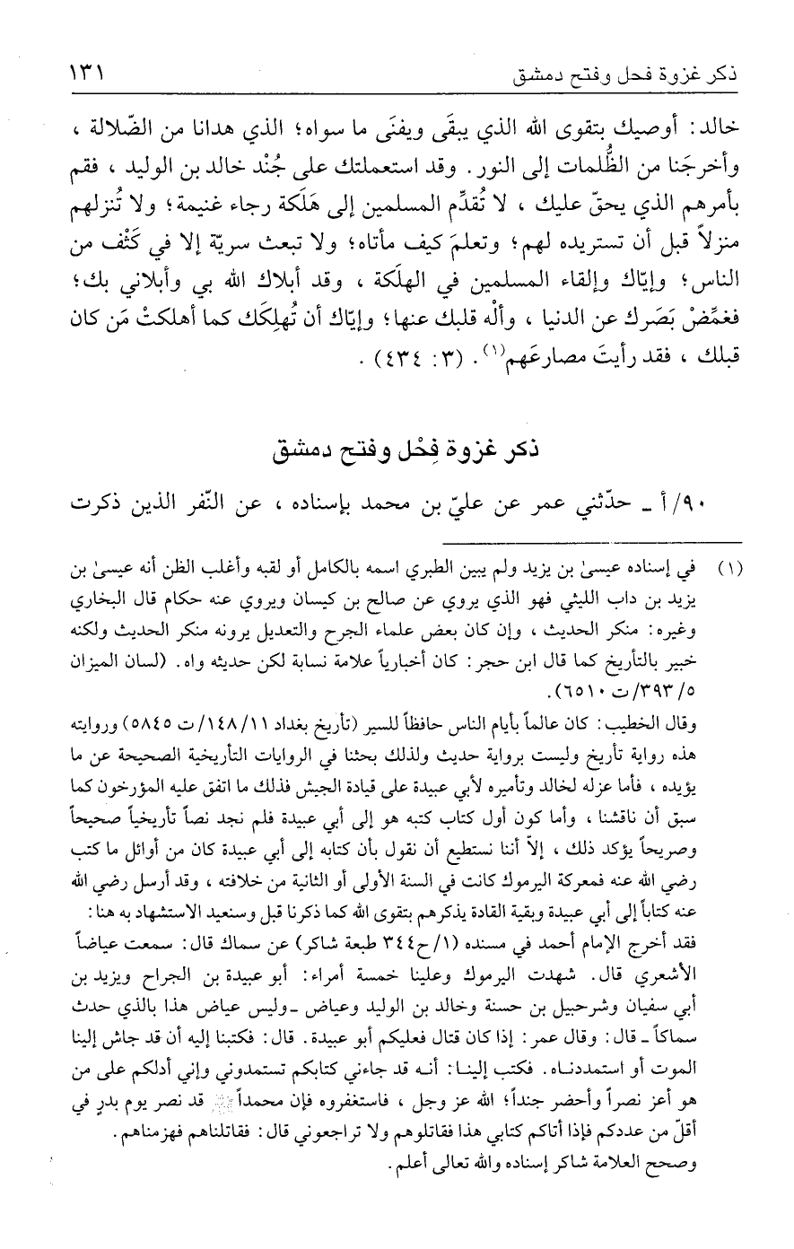وقال الخطيب: كان عالمًا بأيام الناس حافظًا للسير (تأريخ بغداد ١١/ ١٤٨ / ت ٥٨٤٥) وروايته هذه رواية تأريخ وليست برواية حديث ولذلك بحثنا في الروايات التأريخية الصحيحة عن ما يؤيده، فأما عزله لخالد وتأميره لأبي عبيدة على قيادة الجيش فذلك ما اتفق عليه المؤرخون كما سبق أن ناقشنا، وأما كون أول كتاب كتبه هو إلى أبي عبيدة فلم نجد نصًّا تأريخيًا صحيحًا وصريحًا يؤكد ذلك، إلّا أننا نستطيع أن نقول بأن كتابه إلى أبي عبيدة كان من أوائل ما كتب رضي الله عنه فمعركة اليرموك كانت في السنة الأولى أو الثانية من خلافته، وقد أرسل رضي الله عنه كتابًا إلى أبي عبيدة وبقية القادة يذكرهم بتقوى الله كما ذكرنا قبل وسنعيد الاستشهاد به هنا: فقد أخرج الإمام أحمد في مسنده (١ / ح ٣٤٤ طبعة شاكر) عن سماك قال: سمعت عياضًا الأشعري قال: شهدت اليرموك وعلينا خمسة أمراء: أبو عبيدة بن الجراح ويزيد بن أبي سفيان وشرحبيل بن حسنة وخالد بن الوليد وعياض -وليس عياض هذا بالذي حدث سماكًا- قال: وقال عمر: إذا كان قتال فعليكم أبو عبيدة. قال: فكتبنا إليه أن قد جاش إلينا الموت أو استمددناه. فكتب إلينا: أنه قد جاءني كتابكم تستمدوني وإني أدلكم على من هو أعز نصرًا وأحضر جندًا؛ الله عزَّ وجلَّ، فاستغفروه فإن محمدًا - صلى الله عليه وسلم - قد نصر يوم بدرٍ في أقلّ من عددكم فإذا أتاكم كتابي هذا فقاتلوهم ولا تراجعوني قال: فقاتلناهم فهزمناهم.