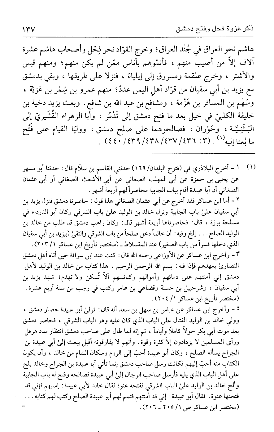 هاشم نحو العراق في جُنْد العراق؛ وخرج القوّاد نحو فِحْل وأصحاب هاشم عشرة آلاف إلّا من أصيب منهم، فأتمّوهم بأناس ممّن لم يكن منهم؛ ومنهم قيس والأشتر، وخرج علقمة ومسروق إلى إيلياءَ، فنزلا على طريقها، وبقي بدمشق مع يزيد بن أبي سفيان من قوّاد أهلِ اليمن عددٌ؛ منهم عمرو بن شِمْر بن غزيَّة، وسَهْم بن المسافر بن هَزْمة، ومشافع بن عبد الله بن شافع. وبعث يزيد دحْية بن خليفة الكلبيّ في خيل بعد ما فتح دمشق إلى تَدْمُر، وأبا الزهراء القُشَيريّ إِلى البَثَنِيَّة، وحَوْران، فصالحوهما على صلح دمشق، ووليَا القيام على فتْح ما بُعثا إليه (١). (٣: ٤٣٧/ ٤٣٦ / ٤٣٨/ ٤٣٩ / ٤٤٠).